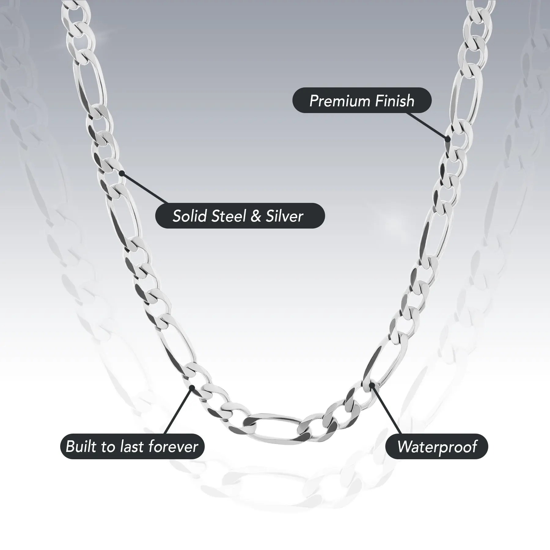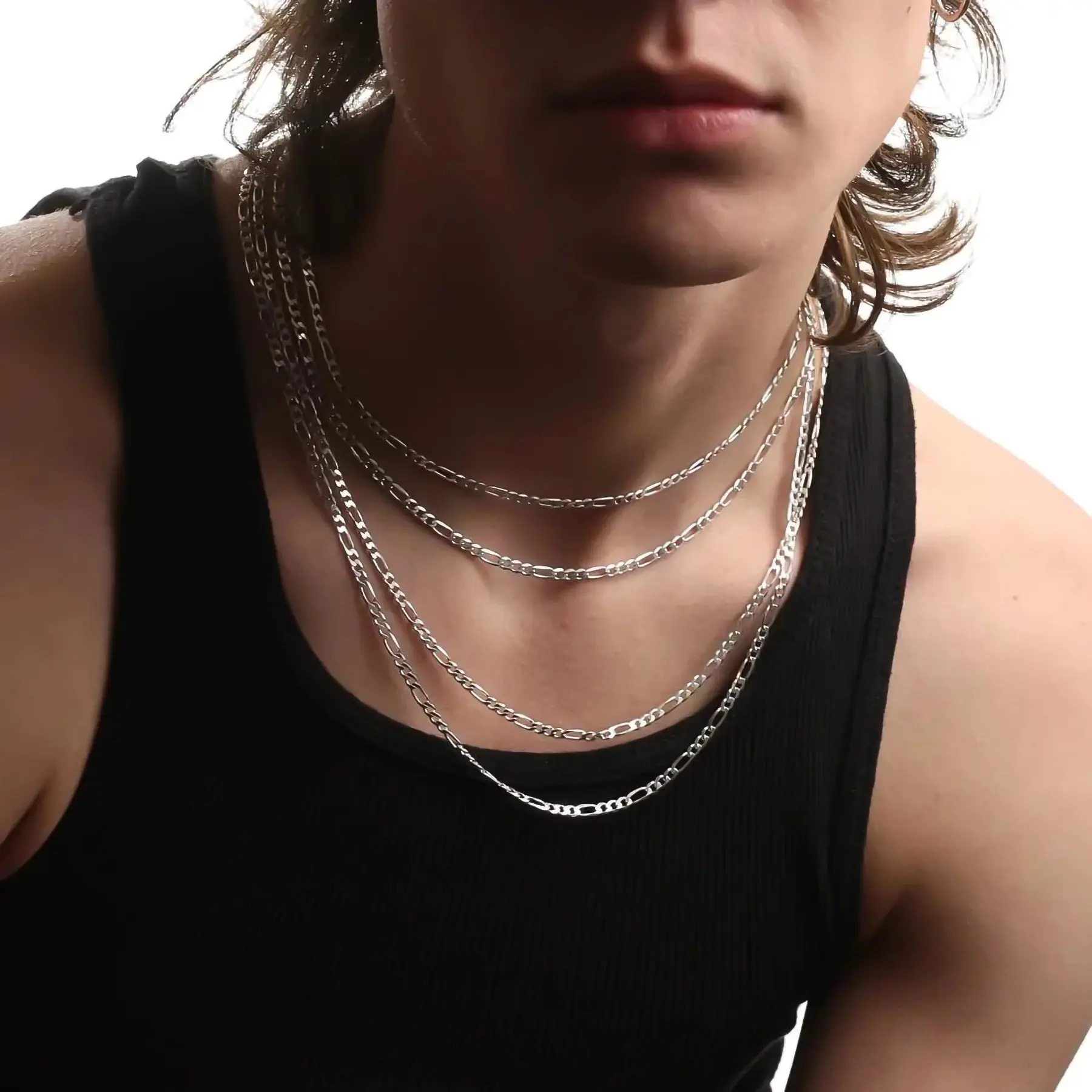 For those who appreciate tasteful elegance within jewelry. The 3mm Sterling Silver Figaro Chain features a timeless pattern that adds a stylish layer of dimensional design - a series of triple links joined by an elongated connecting link. This classic silhouette makes it very versatile, complimenting almost any other accessory and fitting nearly all HJ pendants.