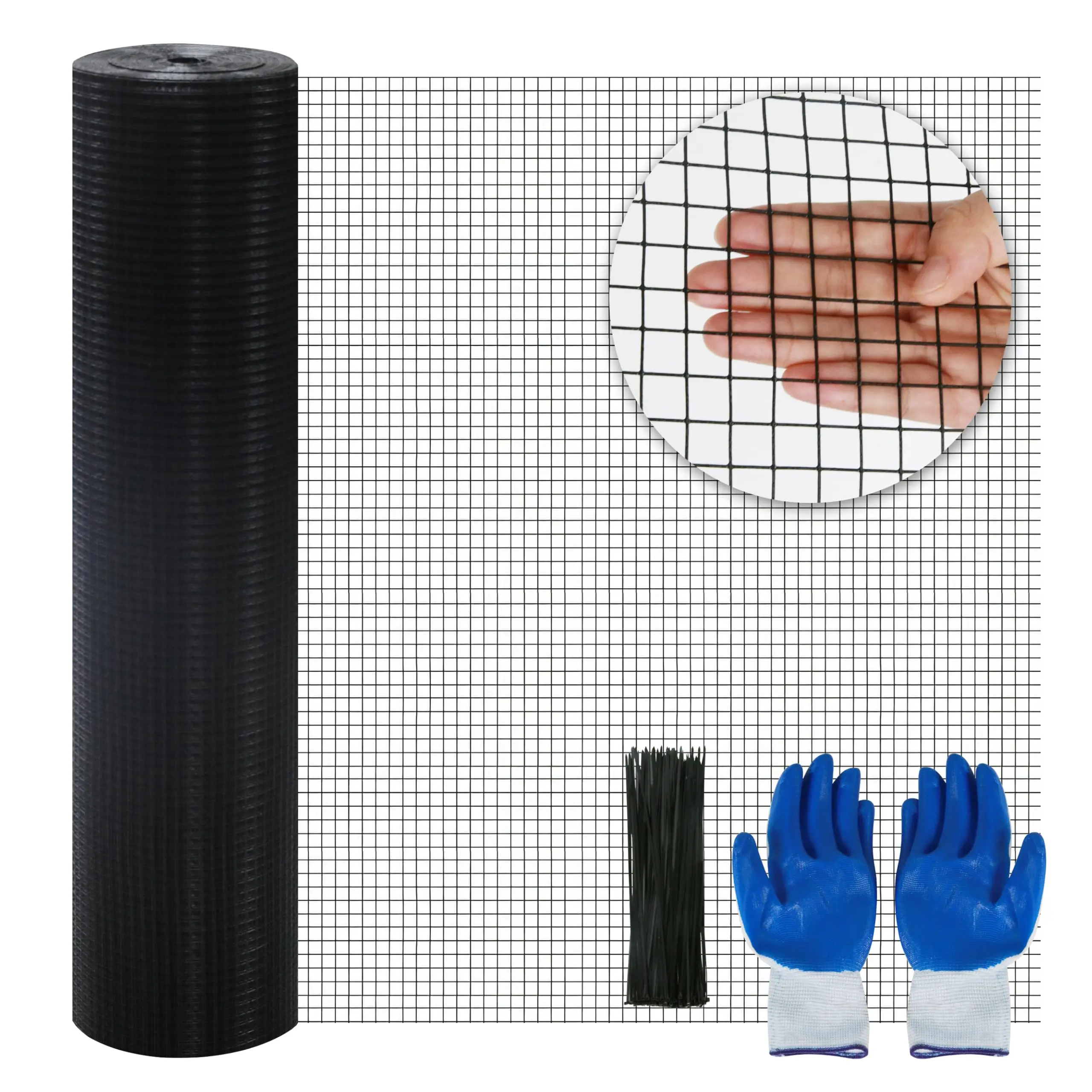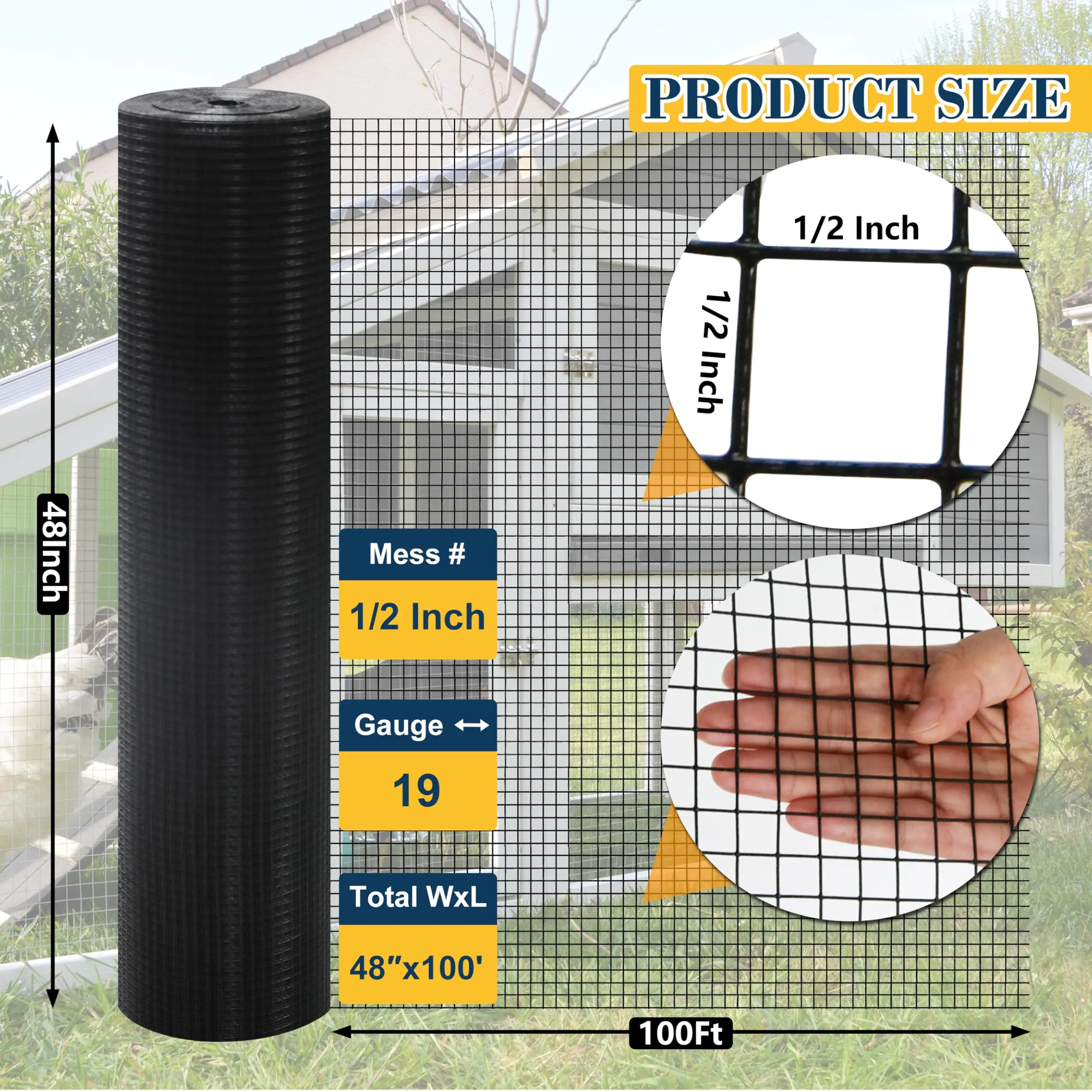 This Hardware Cloth is a 1/2 inch 48" x 100 ft black vinyl metal mesh roll. It's designed for chicken wire fence rolls, offering 19 gauges of strength. Perfect for chicken coops and poultry, this PVC-coated wire ensures durability and safety. The welded wire fencing is ideal for creating secure enclosures.