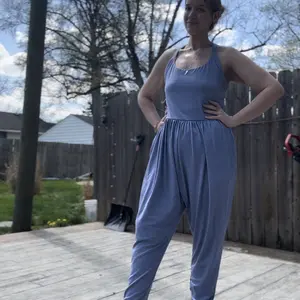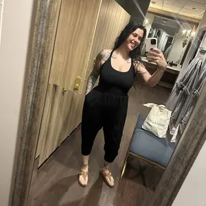 Love everything about this. The top is extremely fitted. I would’ve been comfortable wearing this when I was a 38C. I love the loose bottom. It gets baggier throughout the day but still hit right. Pockets are always a plus!