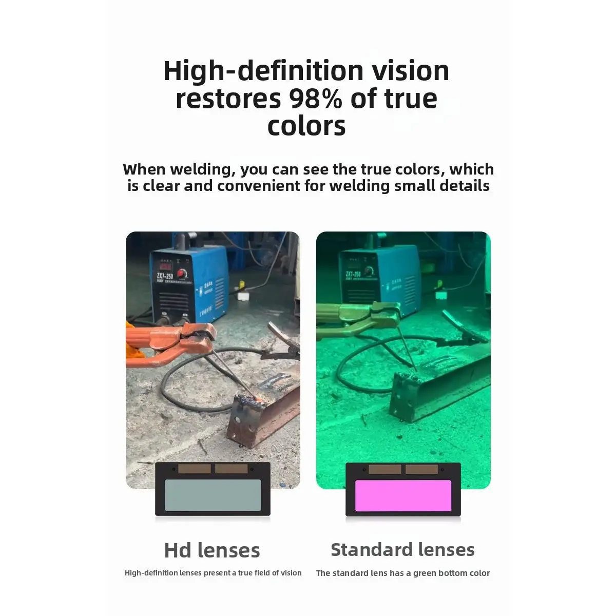 Professional welding helmet with 0.01ms auto-darkening, ensuring instant eye protection. Delivers 98% true color vision for precise, clear welding of fine details. Features a separable design, full-face coverage, impact resistance, and comfortable wear with smooth airflow. Ideal for various welding scenarios, providing safety and enhanced visual accuracy.