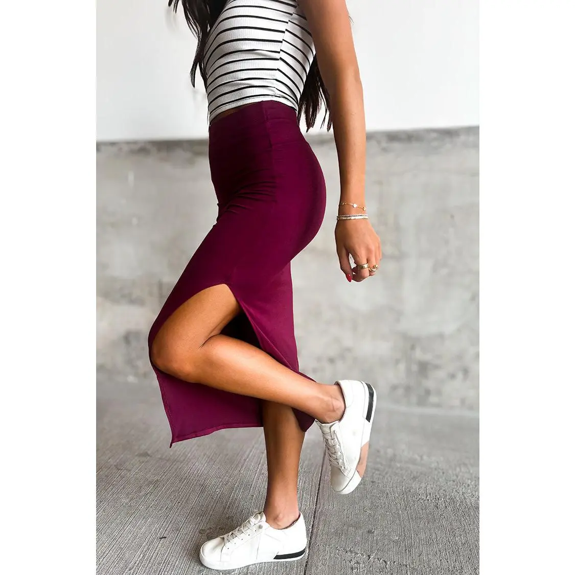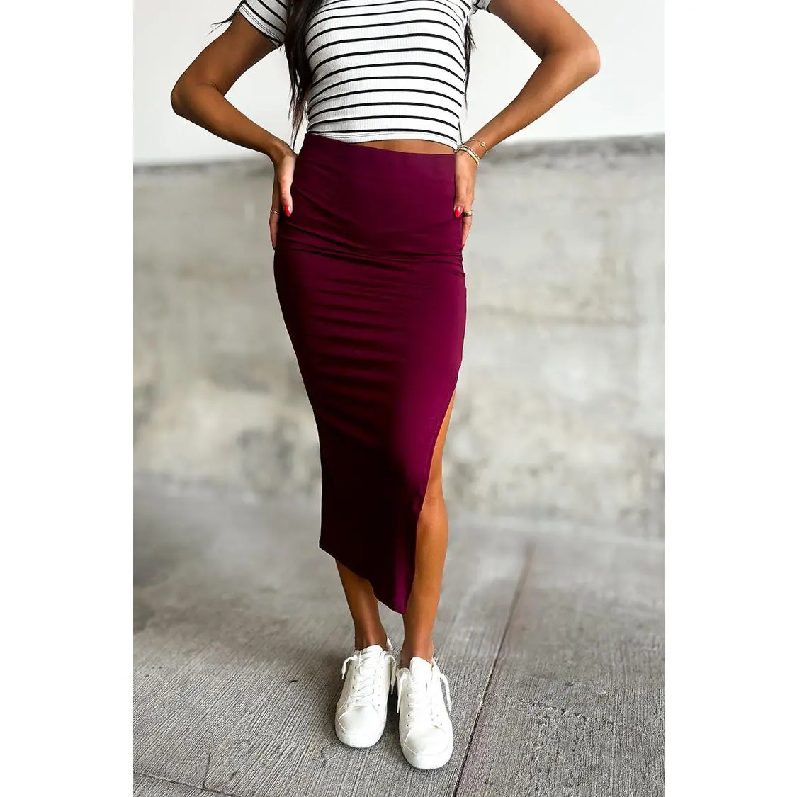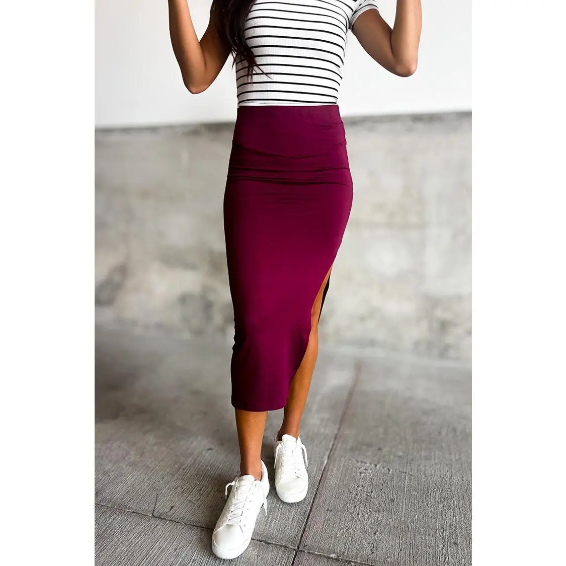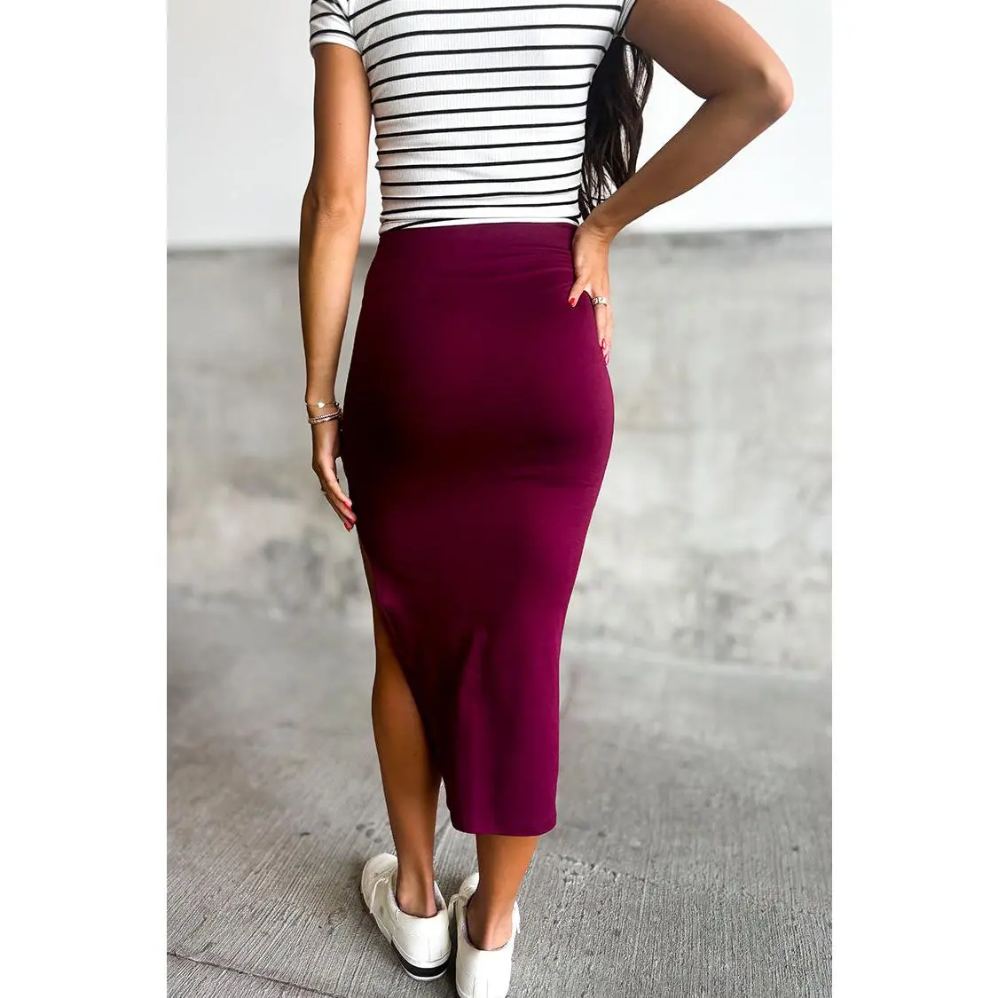 This simple bodycon maxi skirt features a knee-high slit, and a flattering silhouette, pair it with a graphic tee and your favorite sneakers and you're good to go!