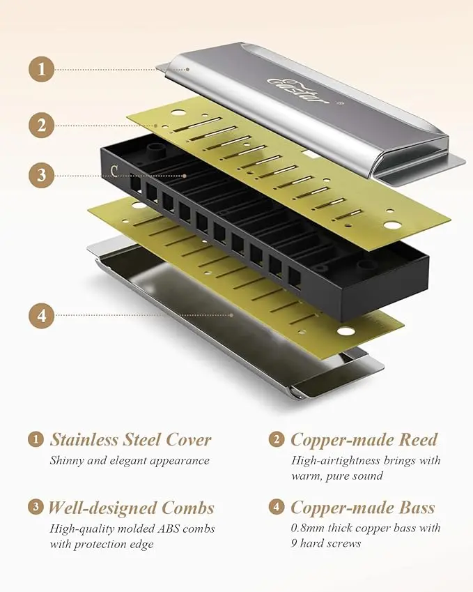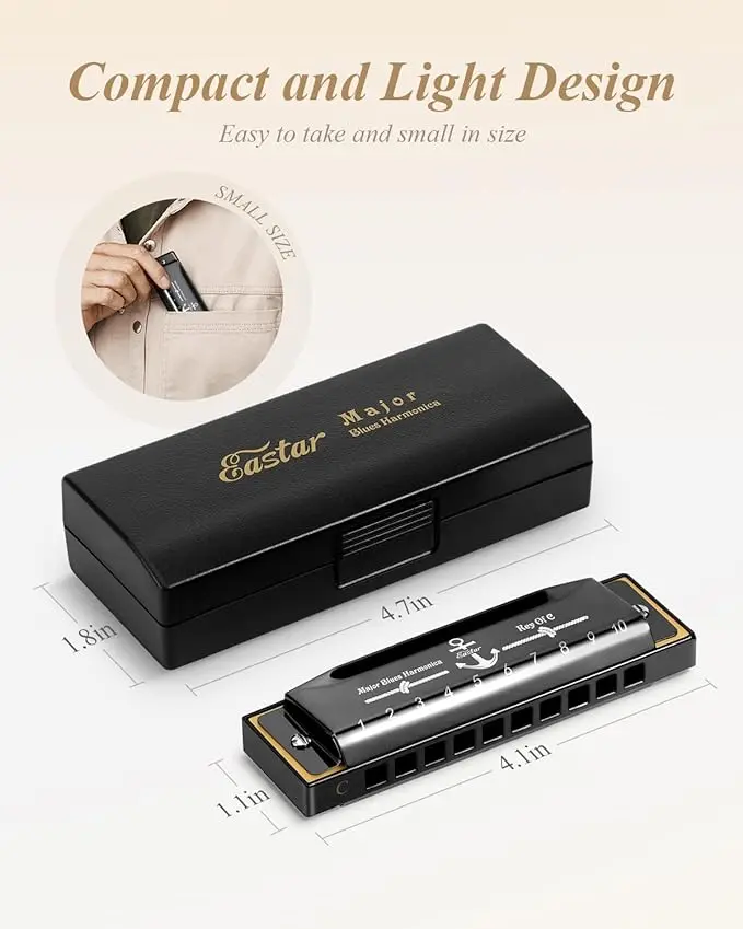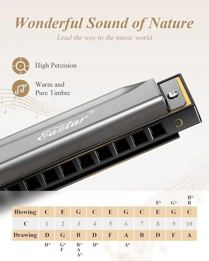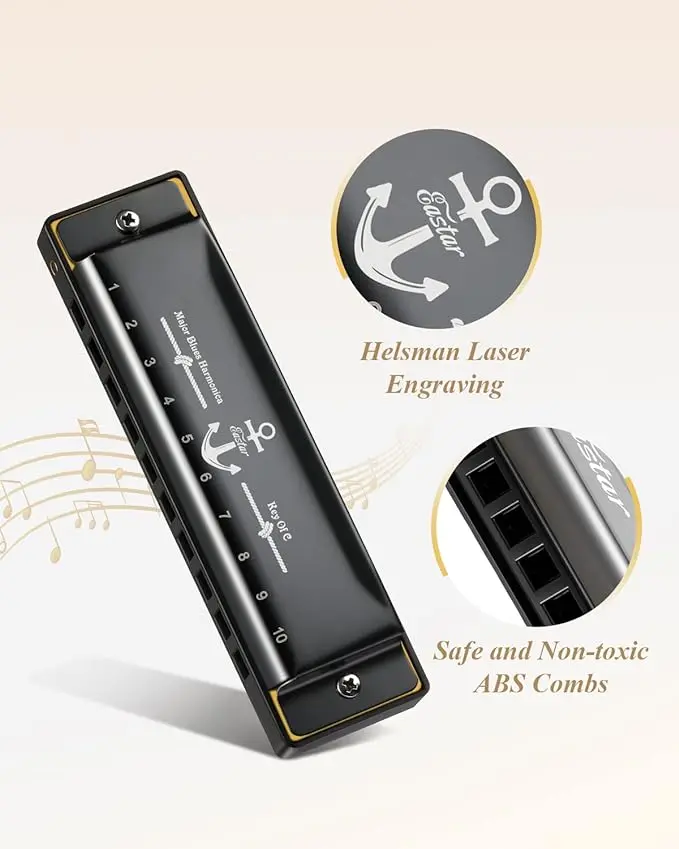 ♬❤️ EASY TO PLAY - Eastar Major Blues One-piece 10 hole, 20 tones Diatonic Harmonica has a pleasant sound, good intonation, and pure tone quality. The key of c harmonica is also a good practice harmonica easy for beginners to play, with vivid and accurate sound.