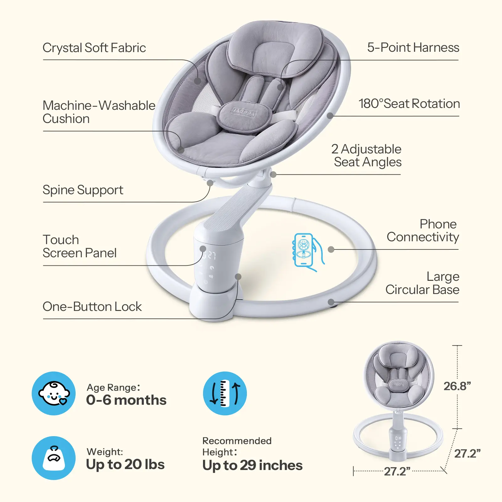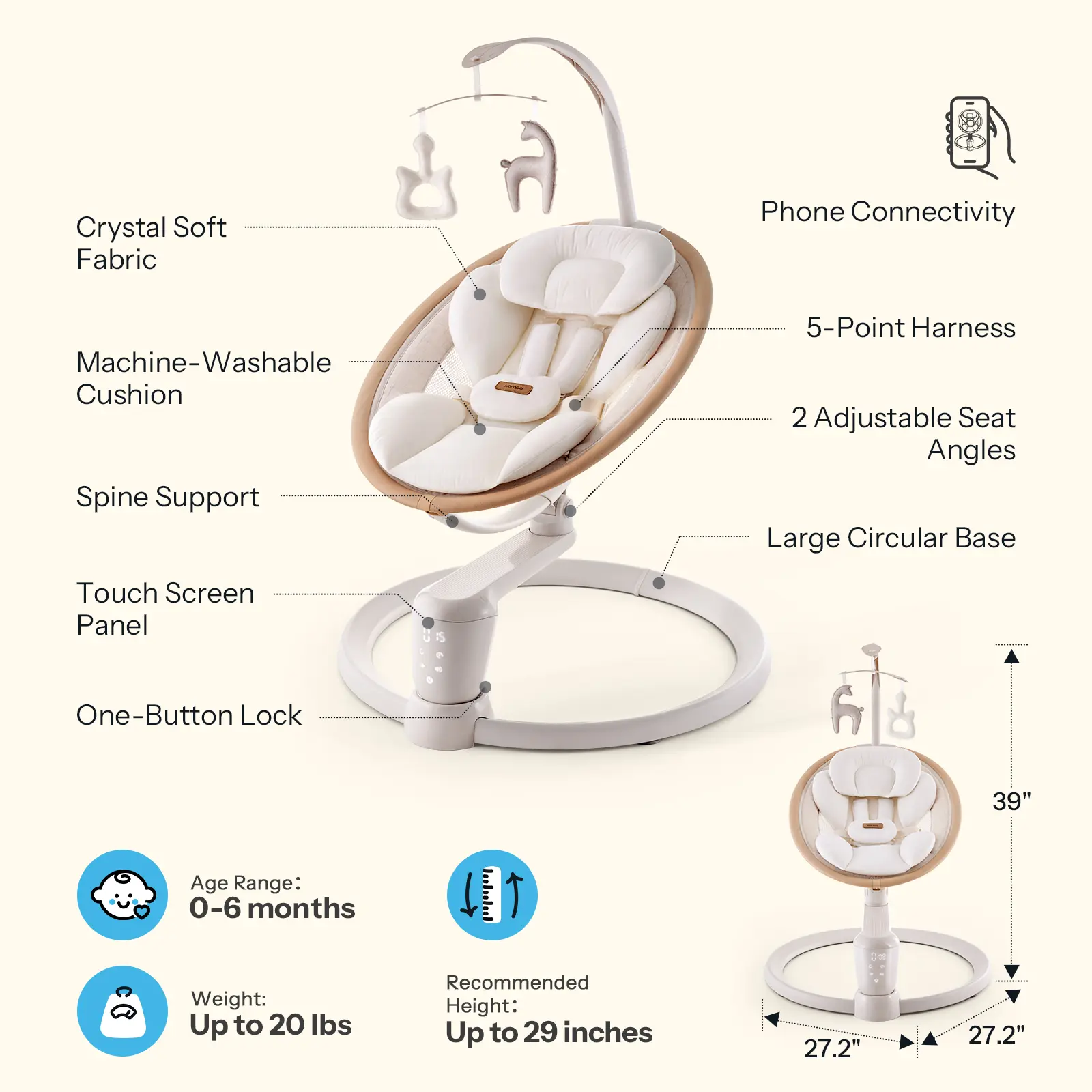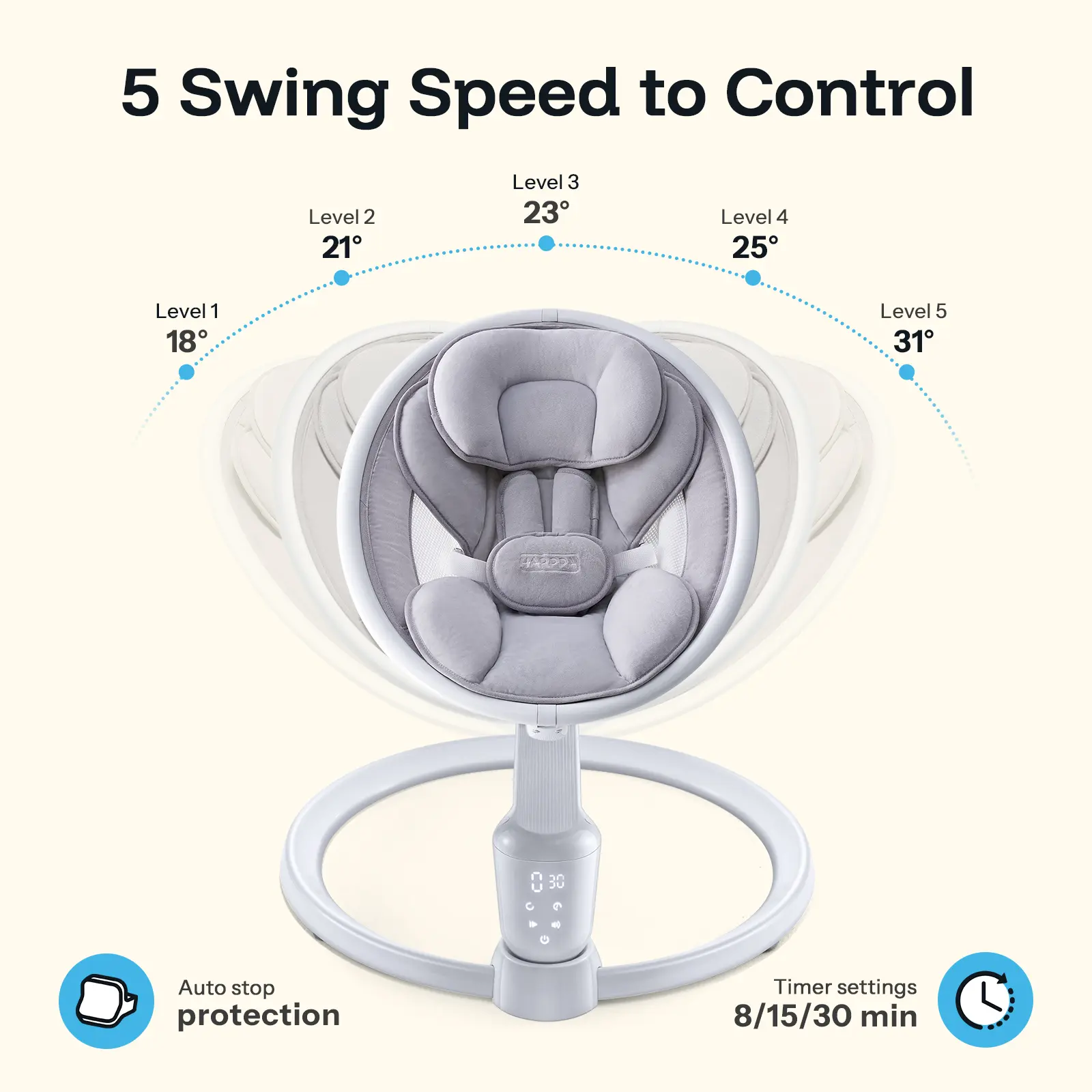 Effortless Control: Five swing speeds mimic natural motions to calm and relax your baby. Easily adjust settings via the touch panel or remote control, with three timer options (8/15/30 minutes).