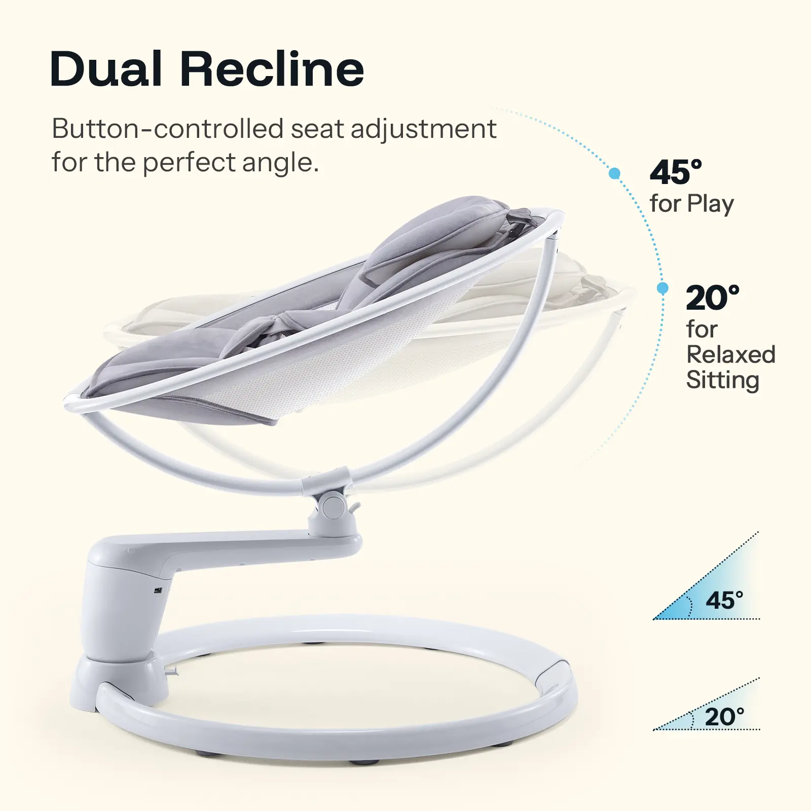 2 Adjustable Seat Positions: 2 recline angles for different moments: a gentle 20° tilt for calm, relaxed comfort, and a 45° angle for feeding or interactive play.