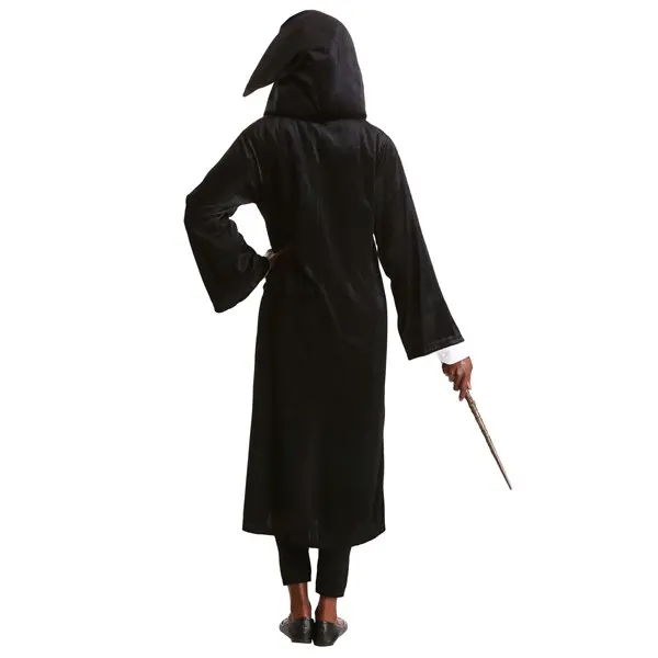 The officially licensed costume robe is shaped from shimmering black velour fabric and features a red satin lining. A faux leather loop and black buttons are attached at the collar and securely fasten the robe around the shoulders. The Gryffindor House crest is appliqued to the front left of the robe, where it shines just above your heart.