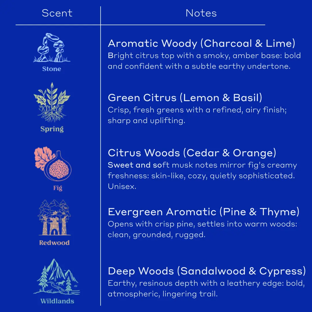 Ā·Redwood: A crisp, woodsy scent.