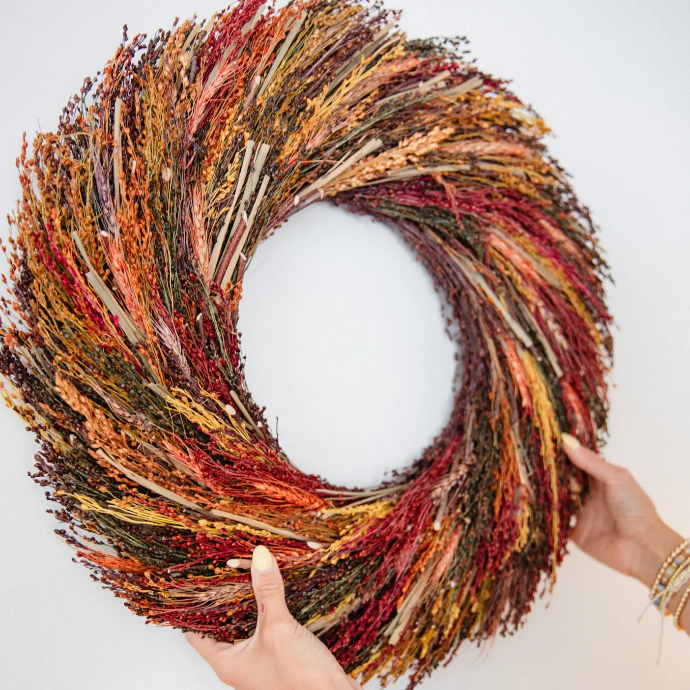Add a touch of autumn charm to your home with this harvest wreath that features a beautiful mix of lifelike willow branches, dried natural wheat, and sorghum grass in vibrant colors. Hang it on your front door or over a mantel to add a rustic-yet-chic feel to your fall decor. From Lauren McBride.