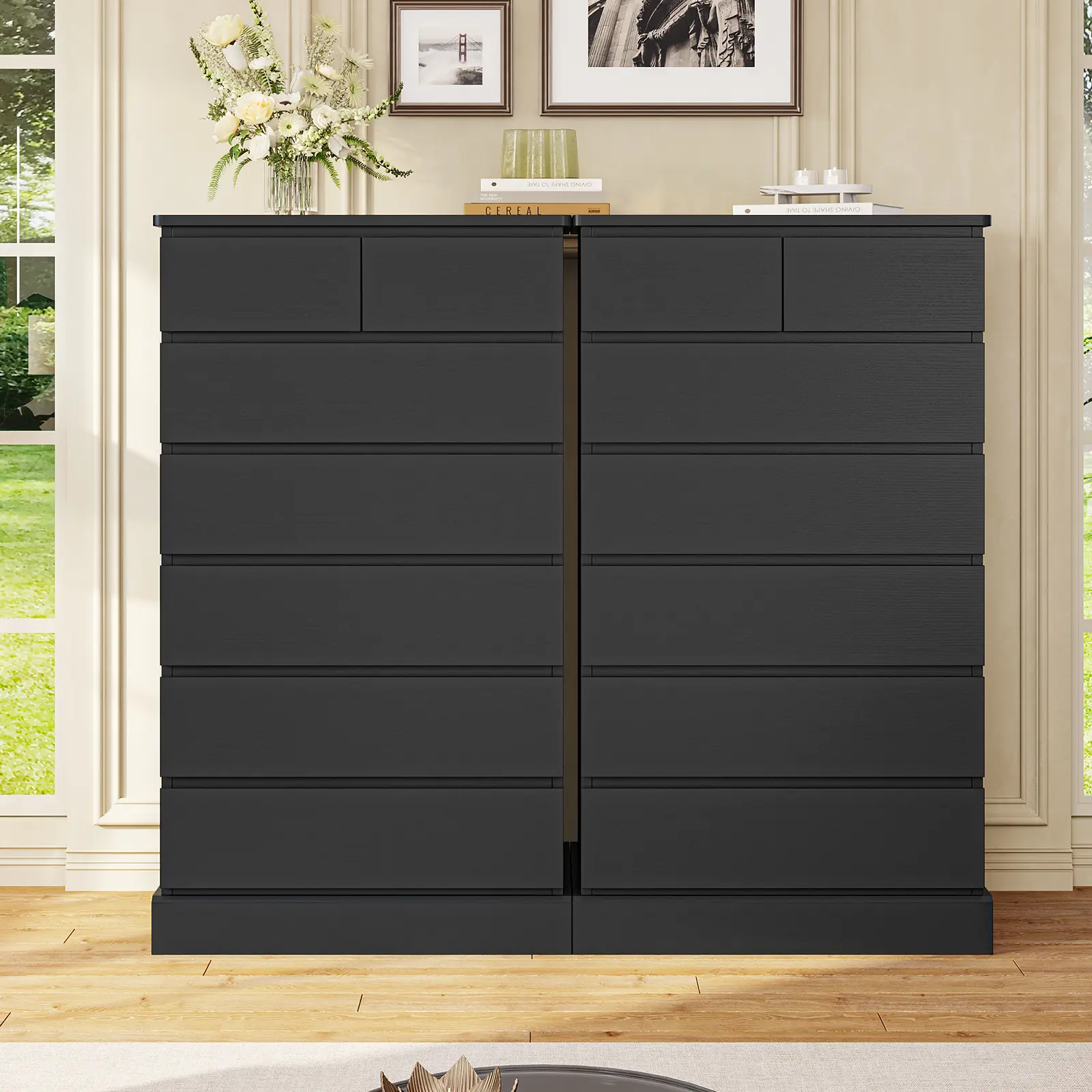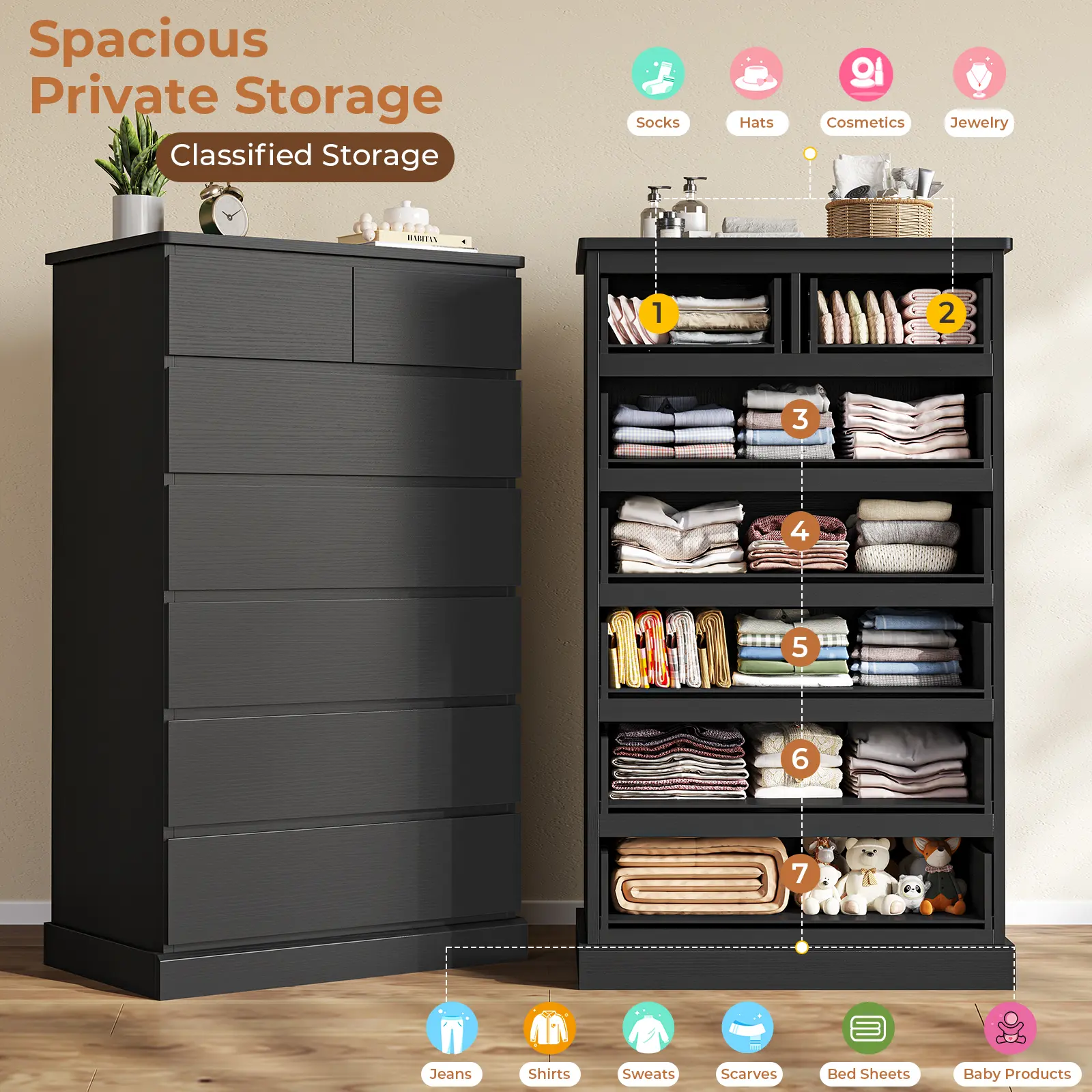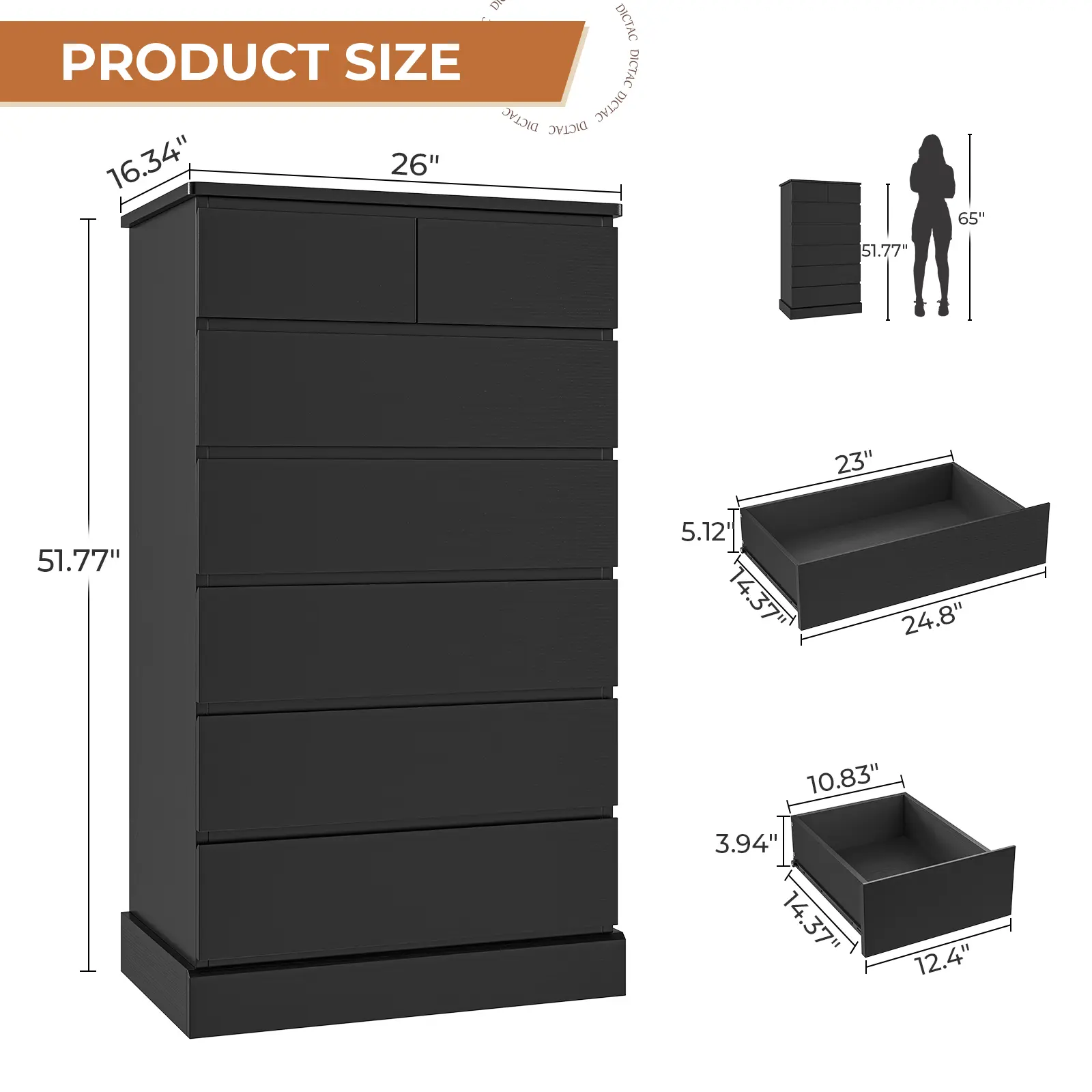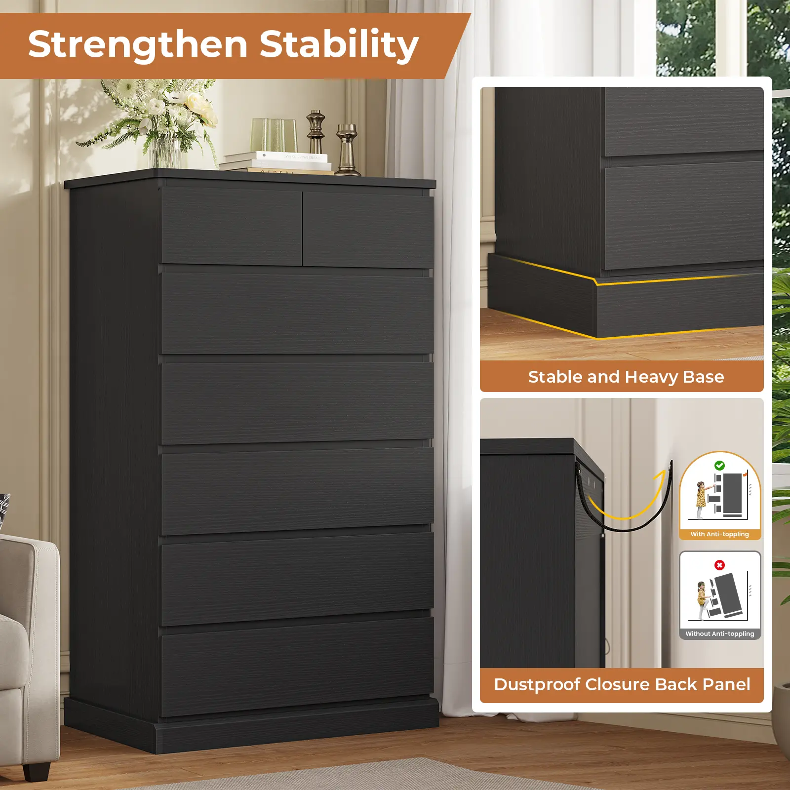 • Modern Elegant Design: Hidden drawer knobs and clean lines create a sleek, contemporary look. • Ample Storage Capacity: 7 drawers: 5 large (22.0"W×13.2"D×4.5"H) and 2 small (9.7"W×13.2"D×3.2"H); overall size 26.0"W×16.4"D×51.8"H. • Durable & Stable Build: FSC-certified engineered wood with reinforced base for lasting stability. • Enclosed Back Panel: Sealed design prevents dust buildup and enhances overall sturdiness. • Easy Assembly & Support: Numbered parts, clear instructions, assembly video, and responsive after-sales service.