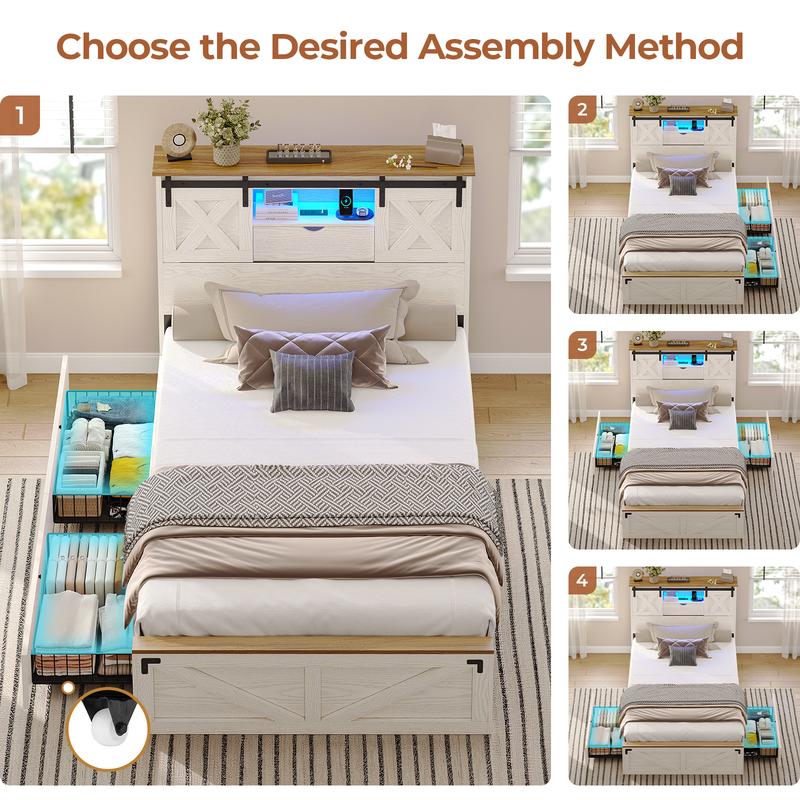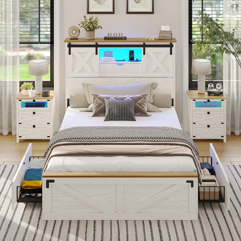 Hasuit Farmhouse Bed Frame Twin Size with 2 Storage Drawers, Wooden Platform Twin Bed with LED Lights and Charging Station, Rustic Accent Headboard with Sliding Barn Door Storage CabinetsHasuit Farmhouse Bed Frame Twin Size with 2 Storage Drawers, Wooden Platform Twin Bed with LED Lights and Charging Station, Rustic Accent Headboard with Sliding Barn Door Storage CabinetsHasuit Farmhouse Bed Frame Twin Size with 2 Storage Drawers, Wooden Platform Twin Bed with LED Lights and Charging Station, Rustic Accent Headboard with Sliding Barn Door Storage CabinetsHasuit Farmhouse Bed Frame Twin Size with 2 Storage Drawers, Wooden Platform Twin Bed with LED Lights and Charging Station, Rustic Accent Headboard with Sliding Barn Door Storage Cabinets
