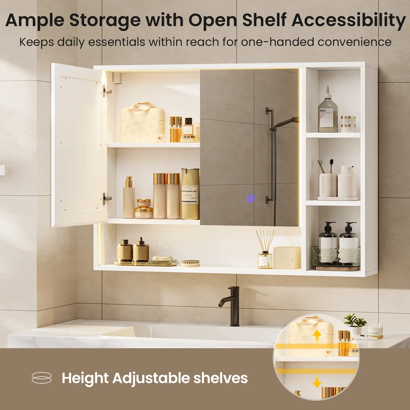 ·【Ample Storage Space】 Combines quick-access open shelves for daily essentials and adjustable interior shelves. Customize your space to neatly organize everything from tall bottles to small cosmetics, keeping your bathroom clutter-free