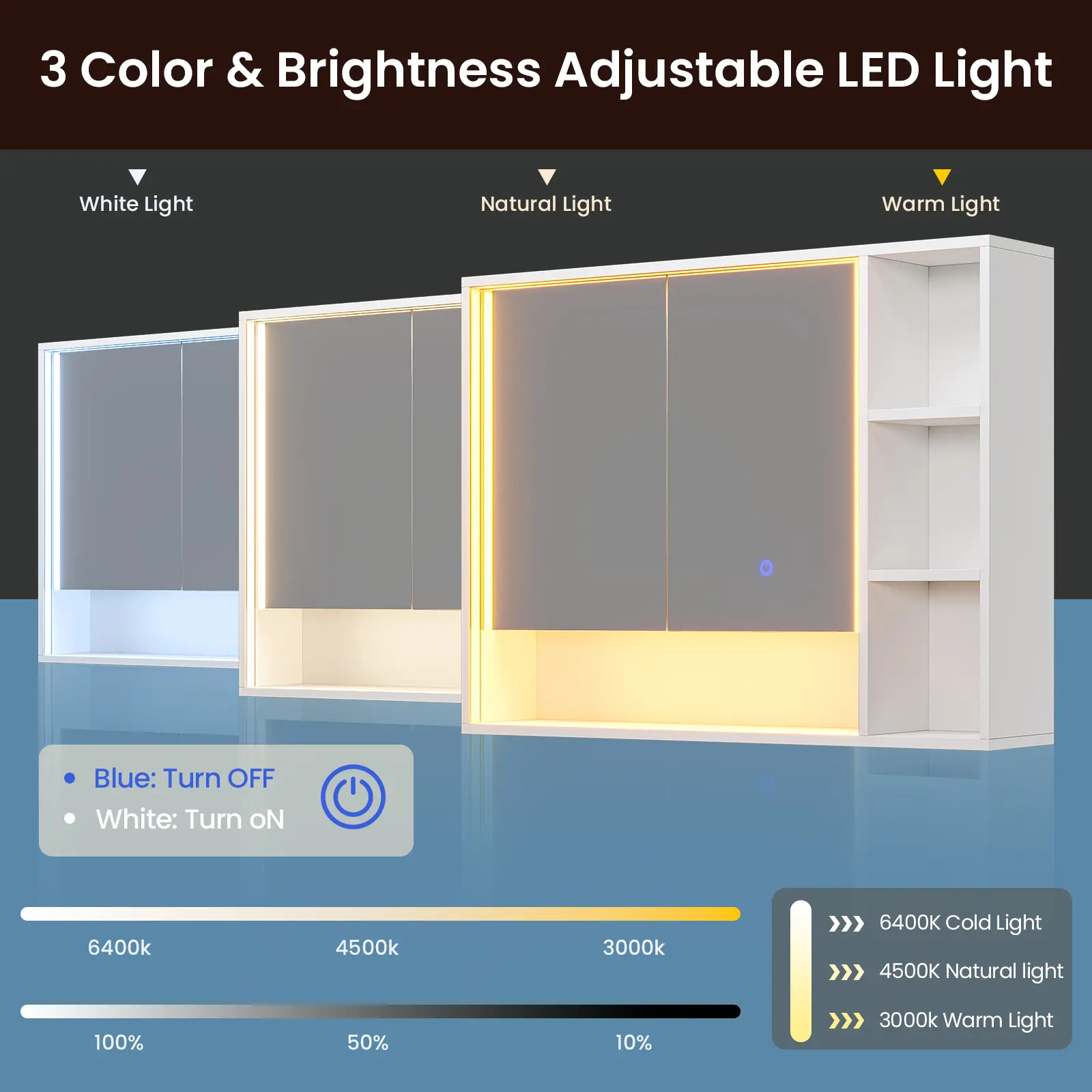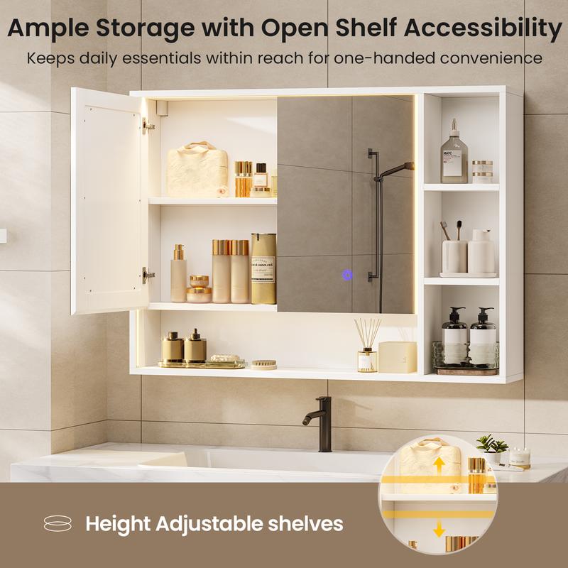·【3 Color & Brightness Adjustable LED Light】This white medicine cabinet features an adjustable LED lighting system with 3 color modes to suit your needs for makeup application or bathroom illumination. The lights include a memory function, no need to adjust again every time