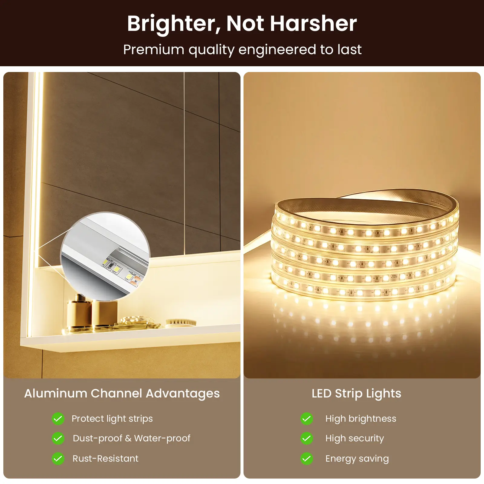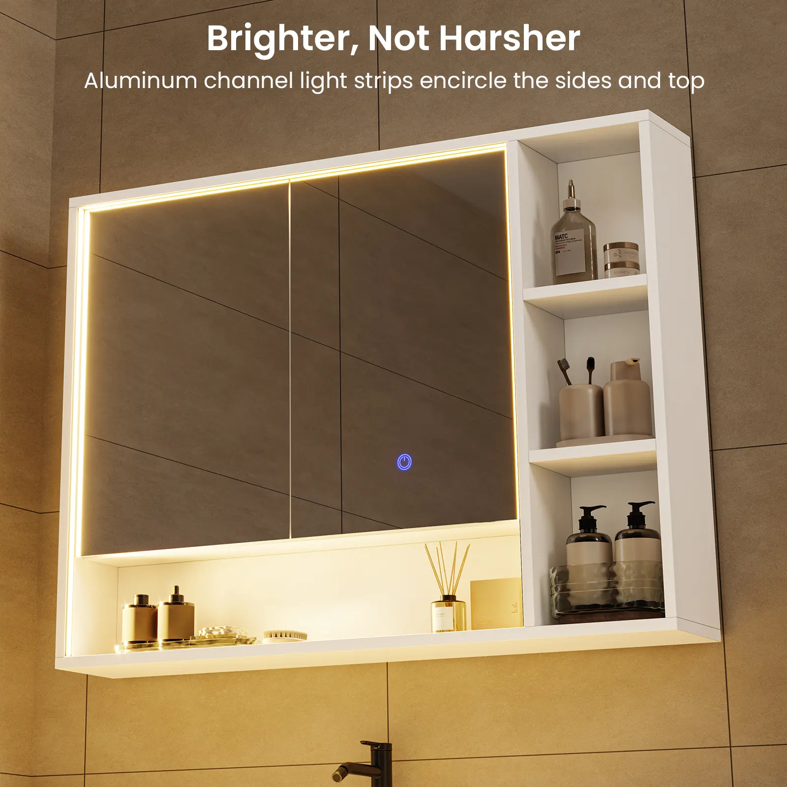 ·【Professional Eye-Care Illumination】Featuring LED light strips embedded in aluminum channels along the sides and top of the mirror frame, it delivers crystal-clear, shadowless illumination — brilliantly bright yet never harsh