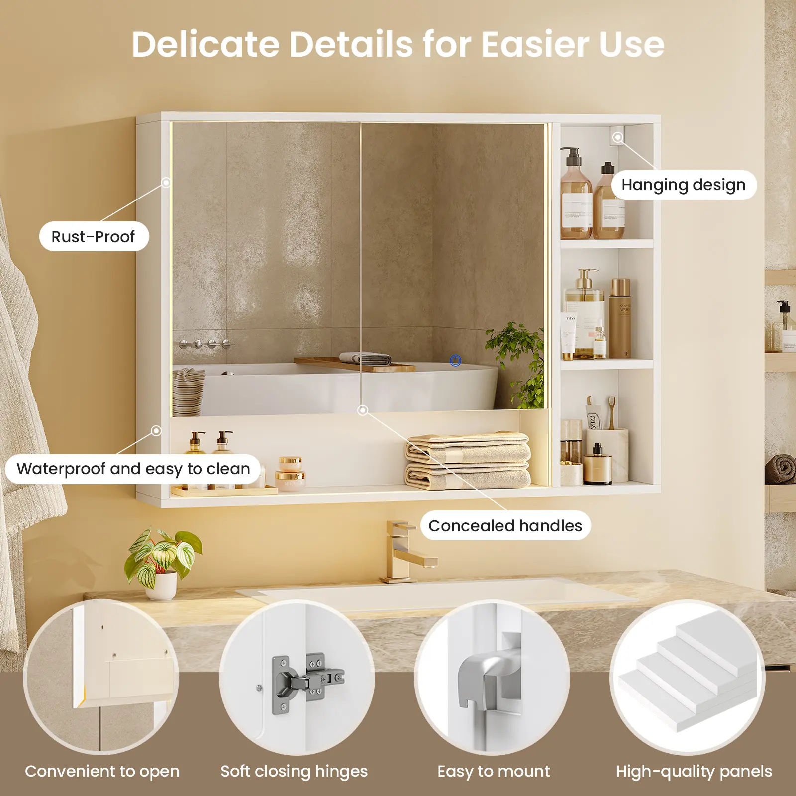 ·【Easy Installation & Thoughtful Design】Comes with installation accessories and clear instructions, plus considerate details like integrated cable management and soft-close doors. The cabinet door hinges are adjustable. If you encounter difficulties when installing the mirrored door, fine-tune it by adjusting the hinge screws