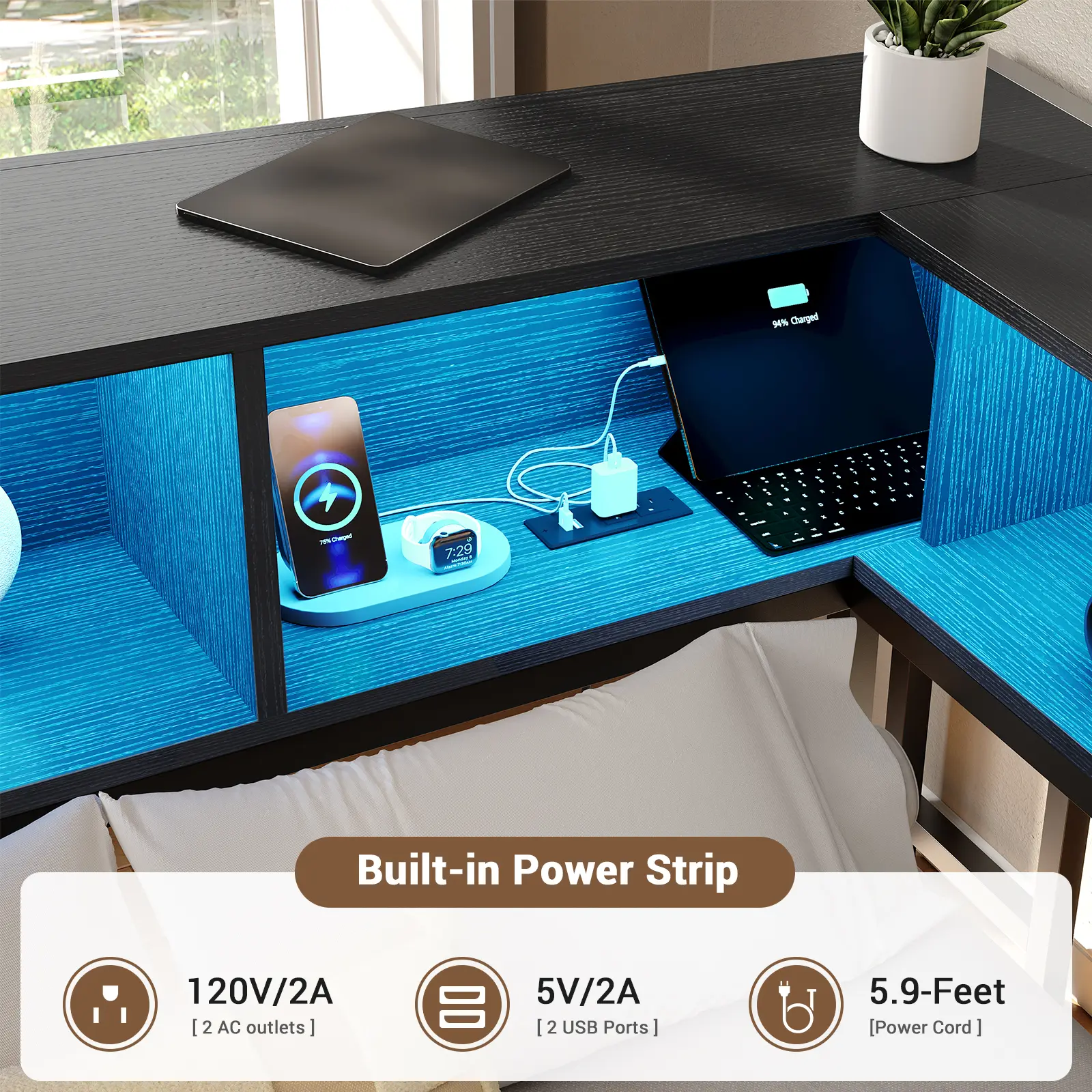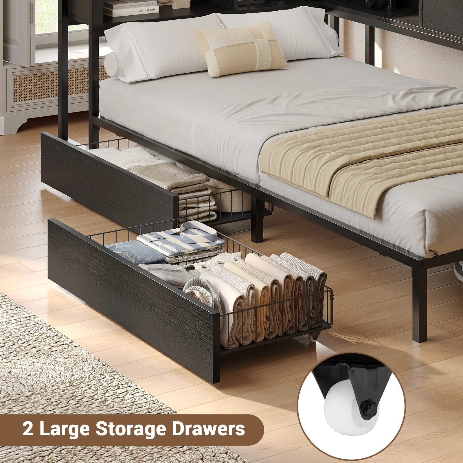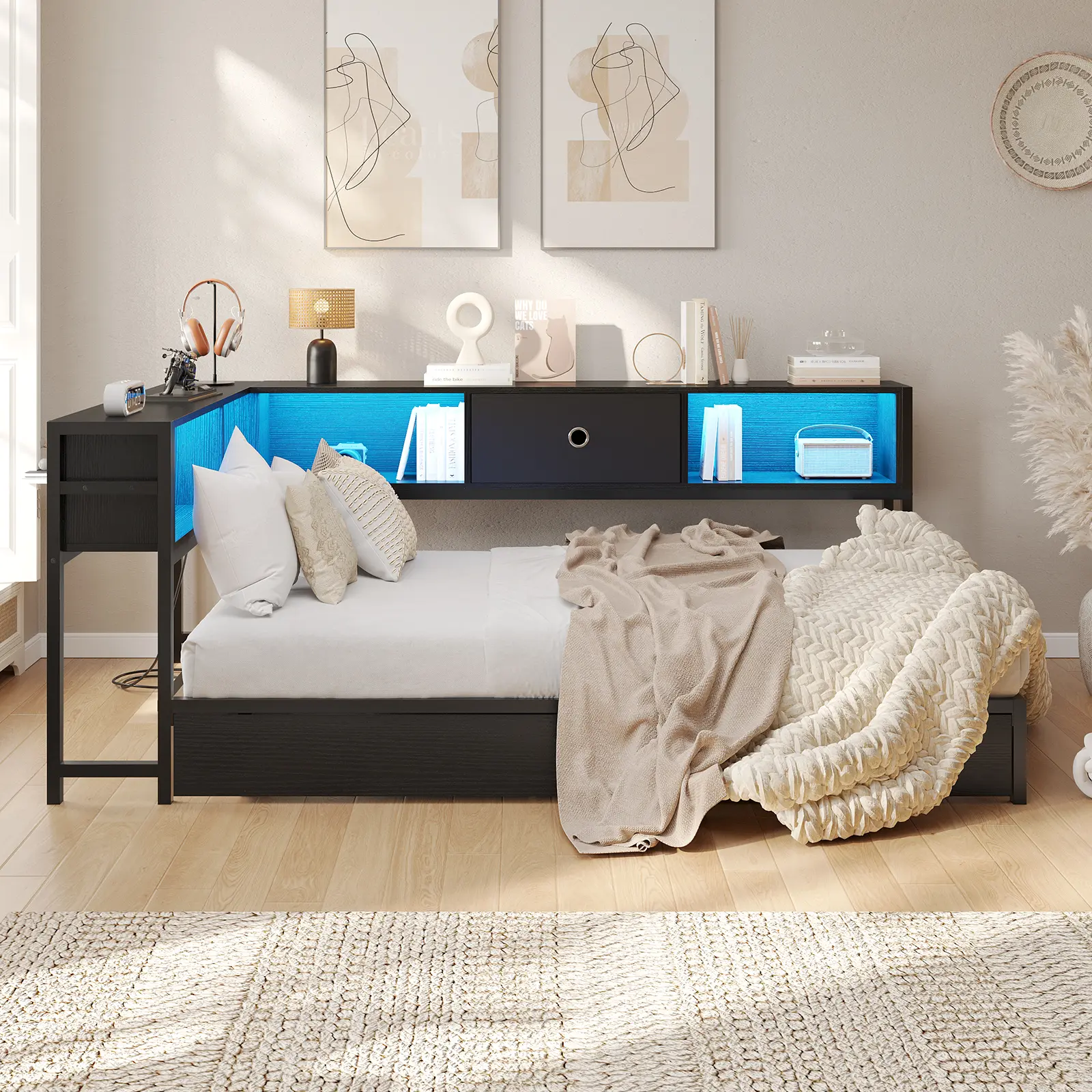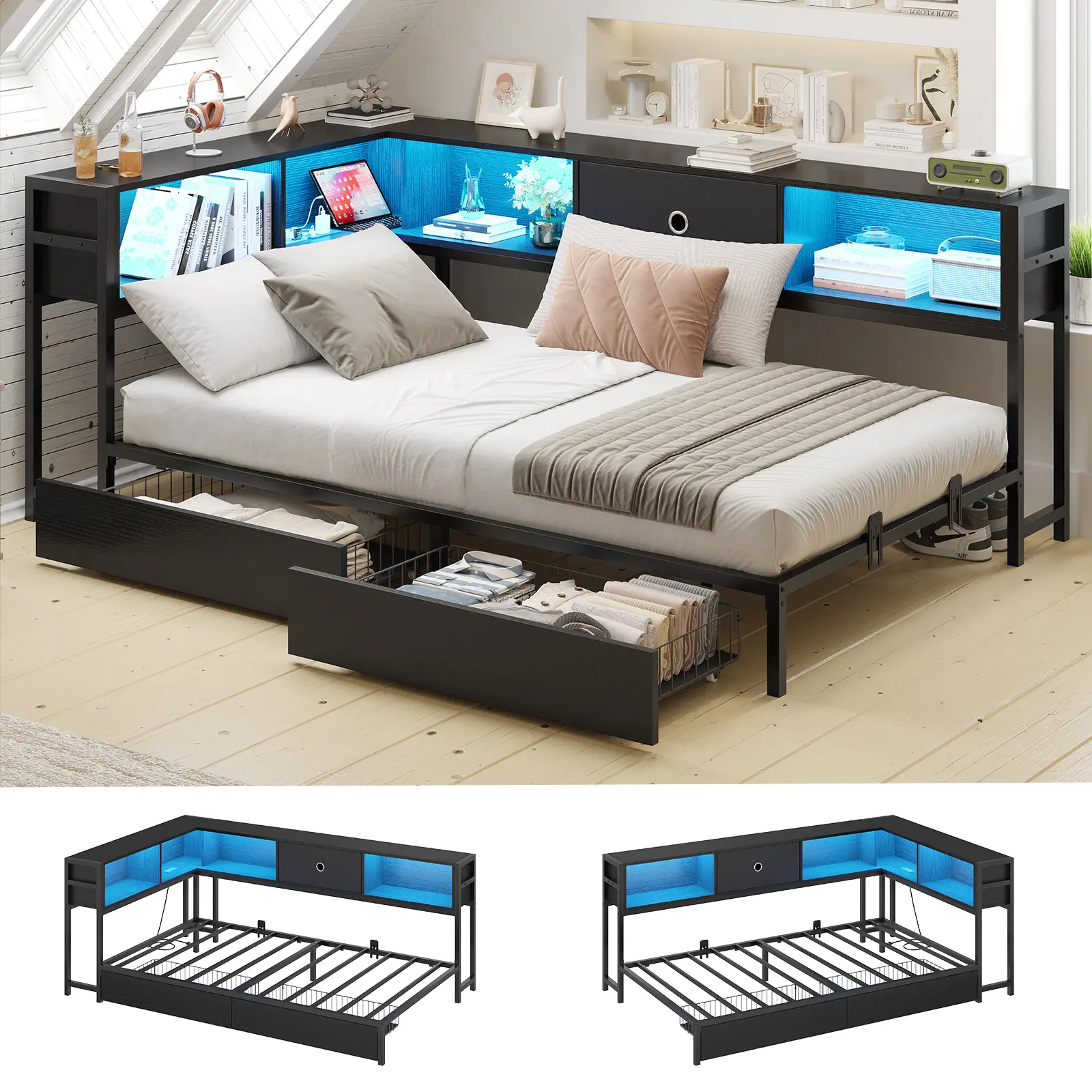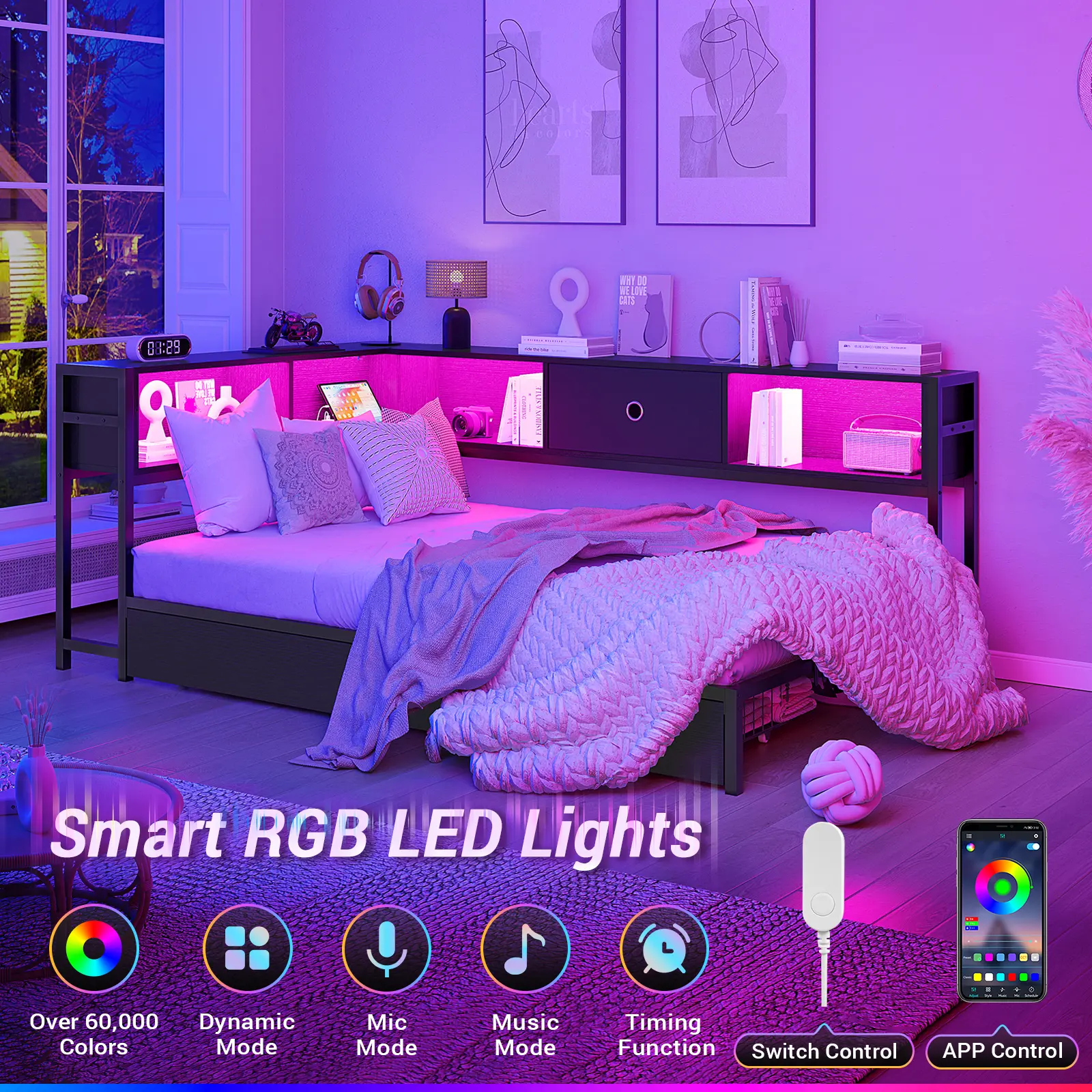 • Space Saving Corner Bed: Three Sizes, cozy lounge, sleep, and storage solution for limited space. • Ample Storage: Integrated headboard bookcase, side shelves, plus 2 large underbed drawers with wheels and secure buckles. • Smart LED Lights: APP/key control, multi-color modes for ambiance. • Built in Charging Station: 2 AC outlets + 2 USB ports for convenient device charging at bedside. • Safe & Durable: Mattress stoppers, plastic corner protectors, easy assembly with detailed instructions and video.