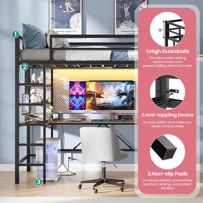 • U-Shaped Loft Design: Twin loft bed with integrated workstation saves 50% floor space. • Built-in Charging Station: Includes 2 USB ports and open shelves for easy device charging. • APP-Controlled RGB Lights: 60,000+ colors with remote/app control. • 400 lbs Heavy-Duty Frame: Thickened steel pipes, anti-tip kit, and high guardrails ensure adult-level safety. • Easy DIY Assembly: Number-coded parts and clear instructions enable quick, hassle-free setup.