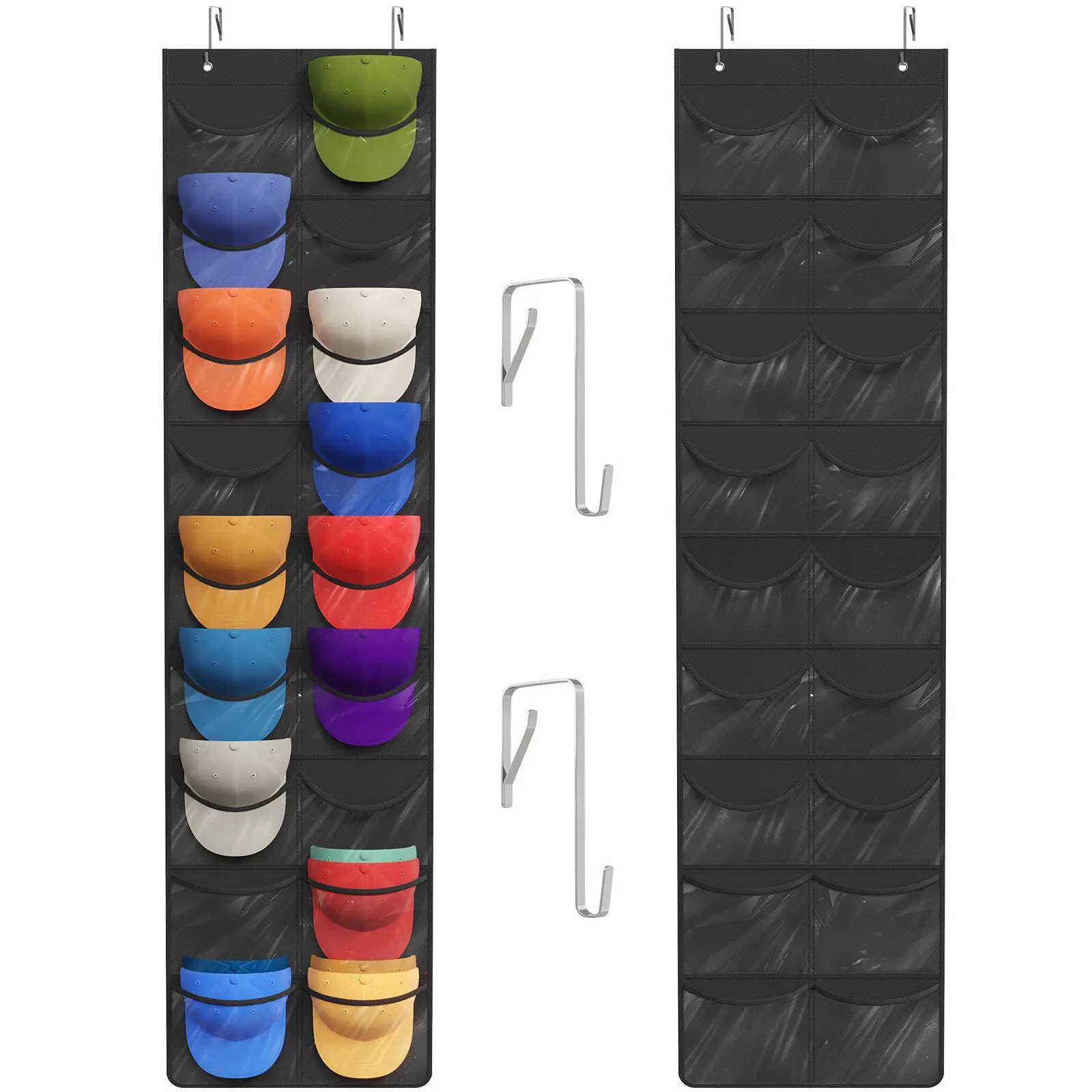 Installation: Simply pass the three metal hooks through the hat organizer, then attach the hooks to the door to hang the cap storage bag behind the door