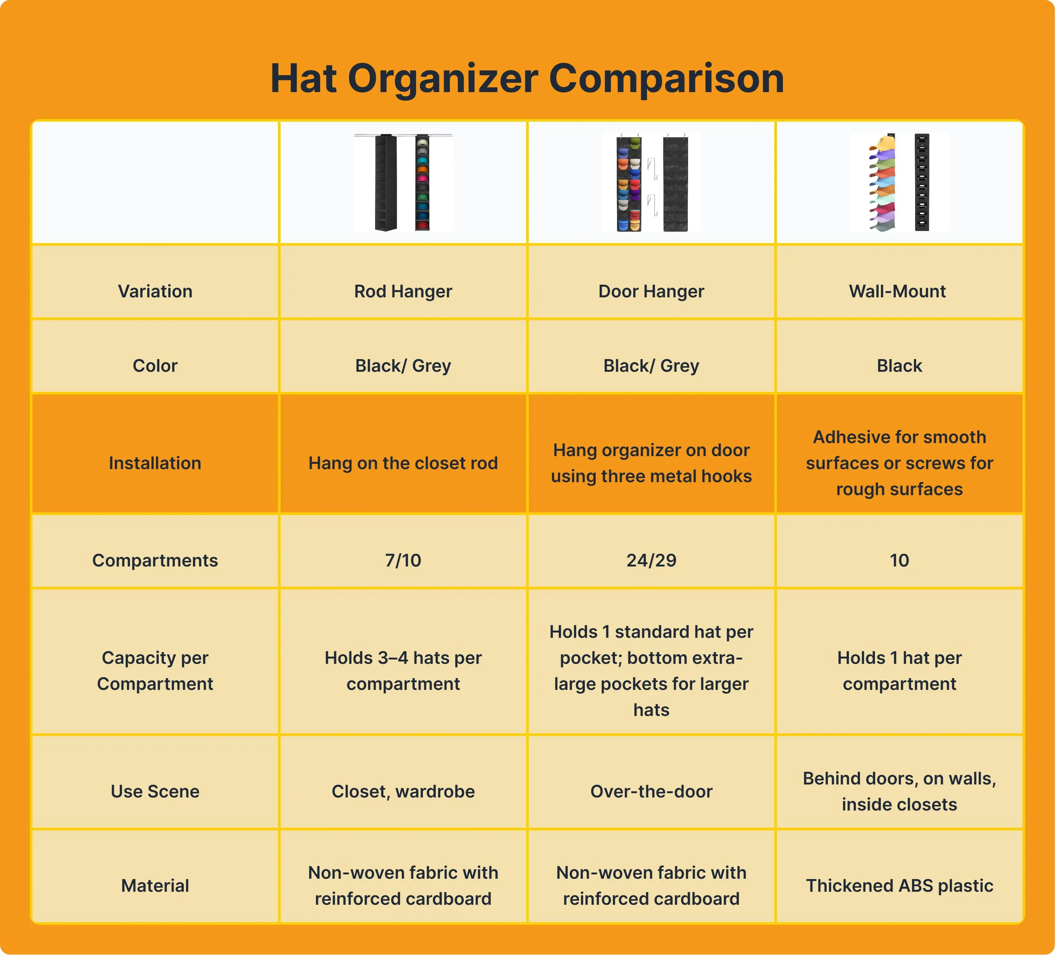 Capacity per Compartment: Holds 1 standard hat per pocket; bottom extra-large pockets accommodate larger hats