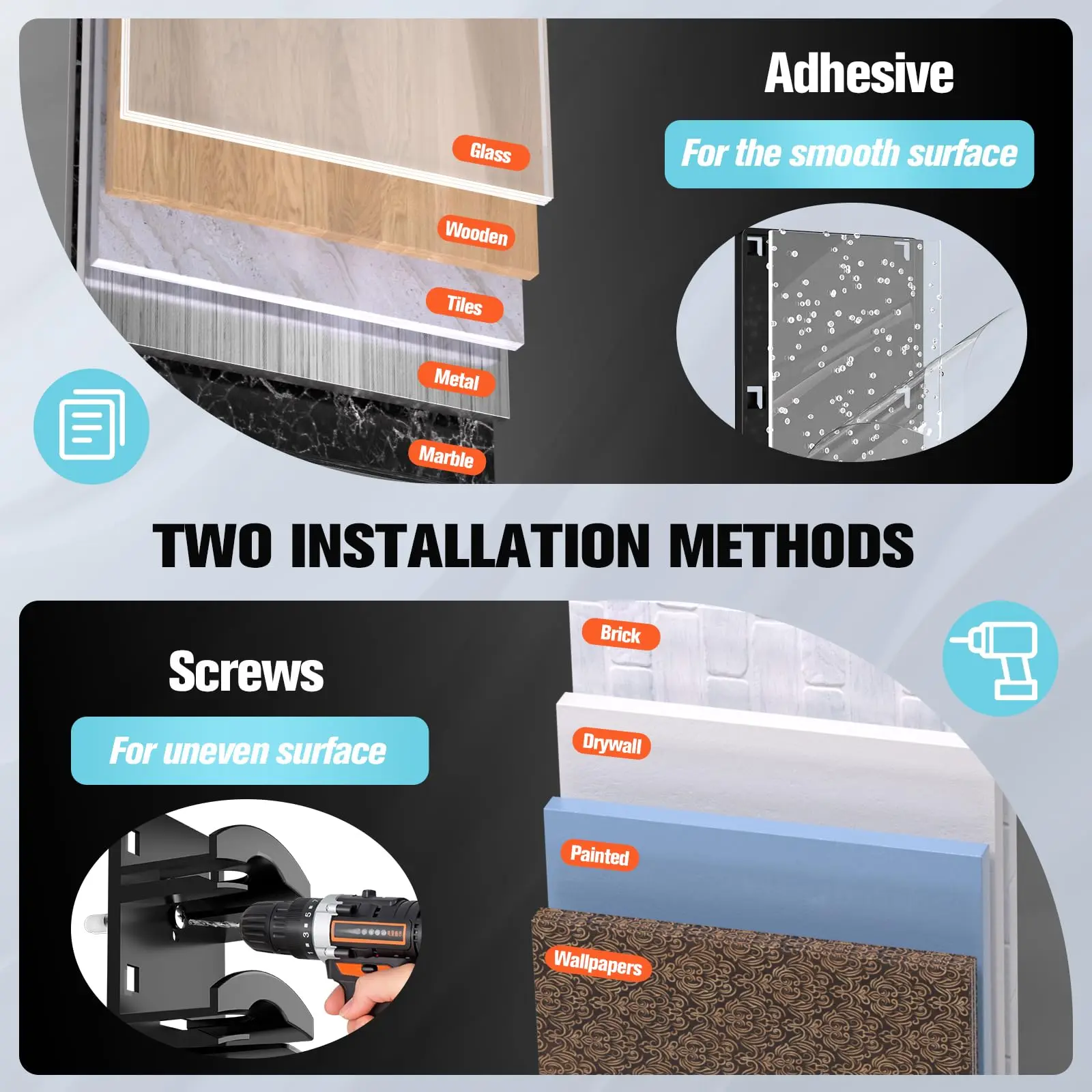 ·TWO INSTALLATIONS METHODS: Hat Rack for wall can be installed in two ways: self-adhesive and screw drilled holes. You can choose the appropriate method according to the usage scenario. Note: Due to the firm sticking, please confirm the direction and position before sticking, the part of the wall plate with holes is the top to avoid forming repeated tears