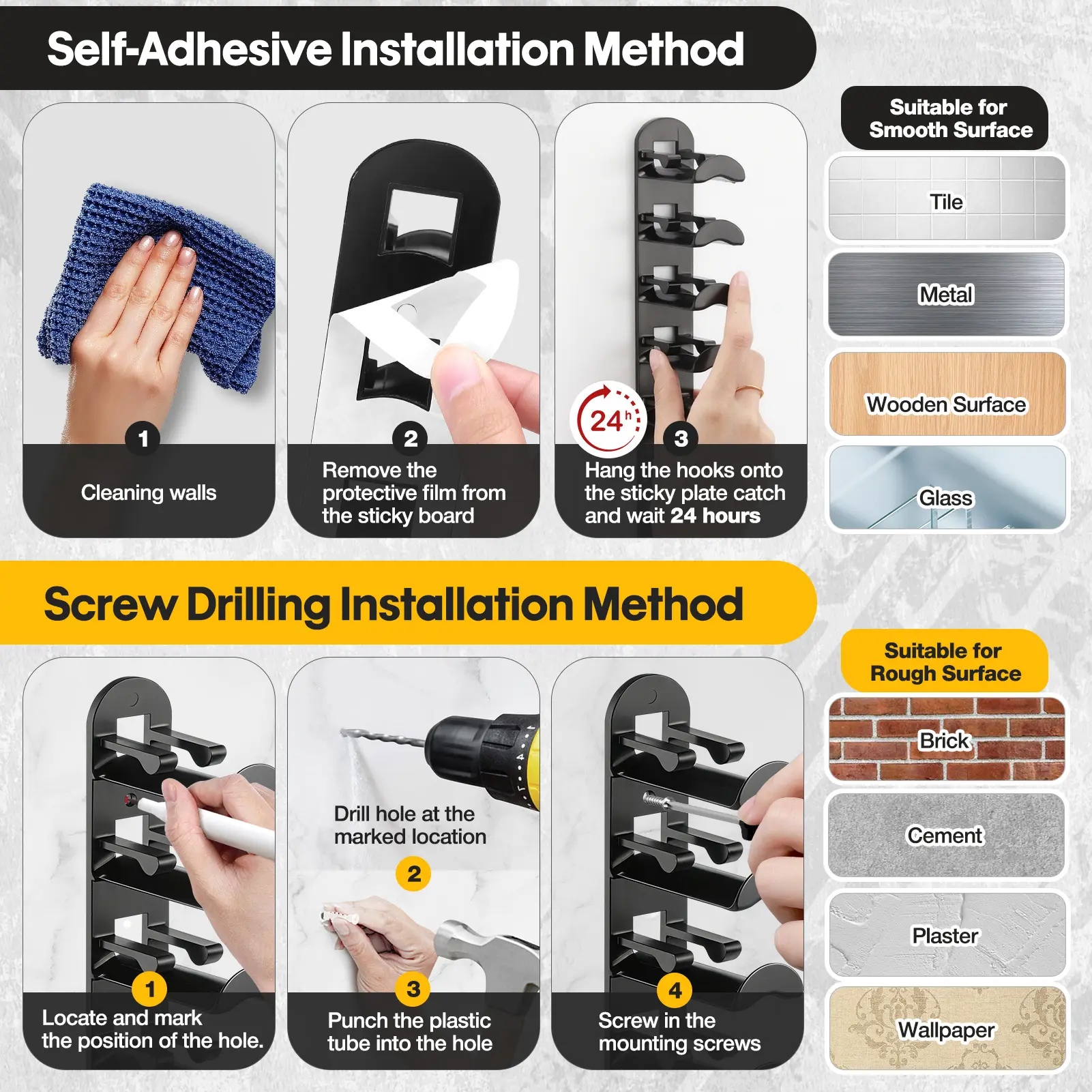 Multi-purpose- Suitable for closets, doors, wardrobes, marble, refrigerators- Can be used on rough surfaces- Drill holes and use screws for installation