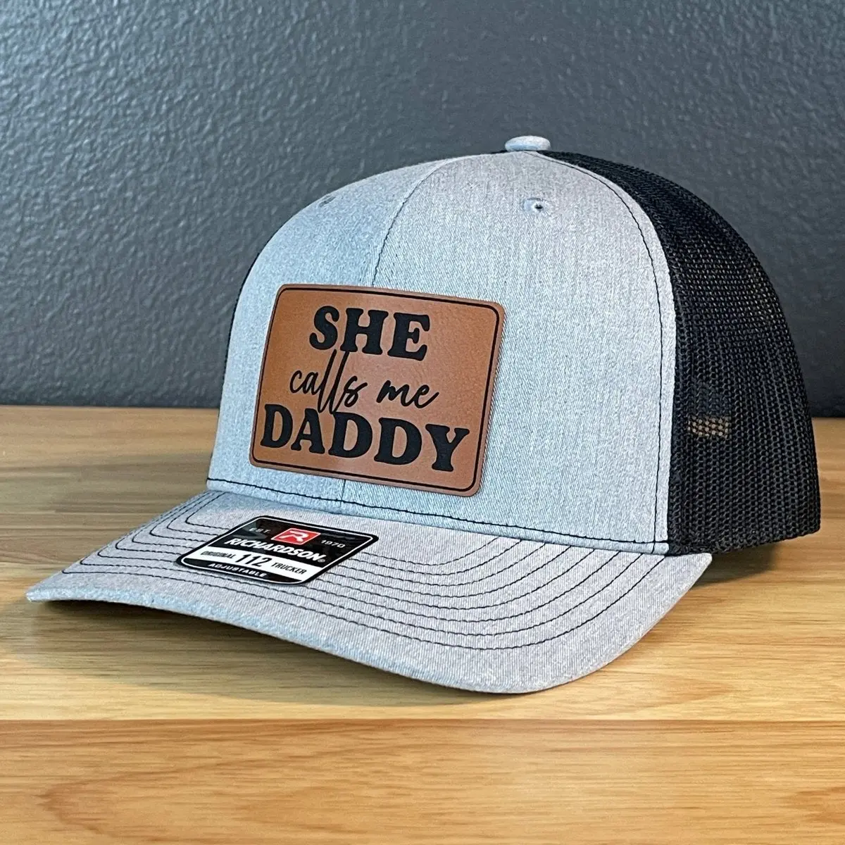 5. She Calls Me Daddy Funny Leather Patch Hat Heather Grey/Black