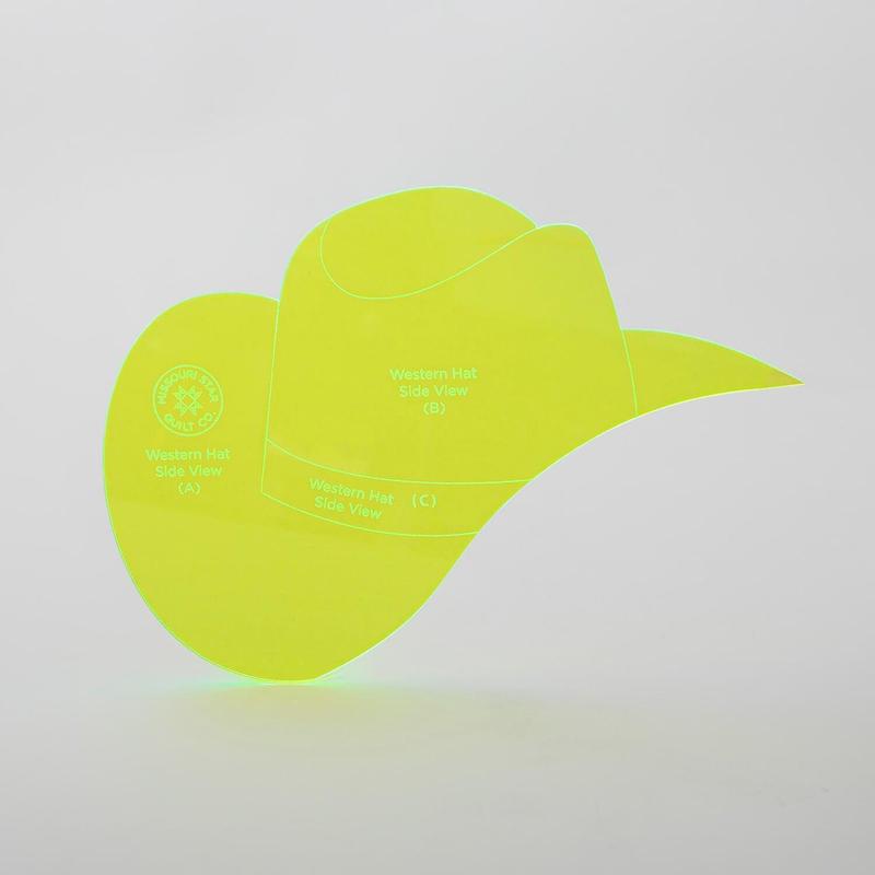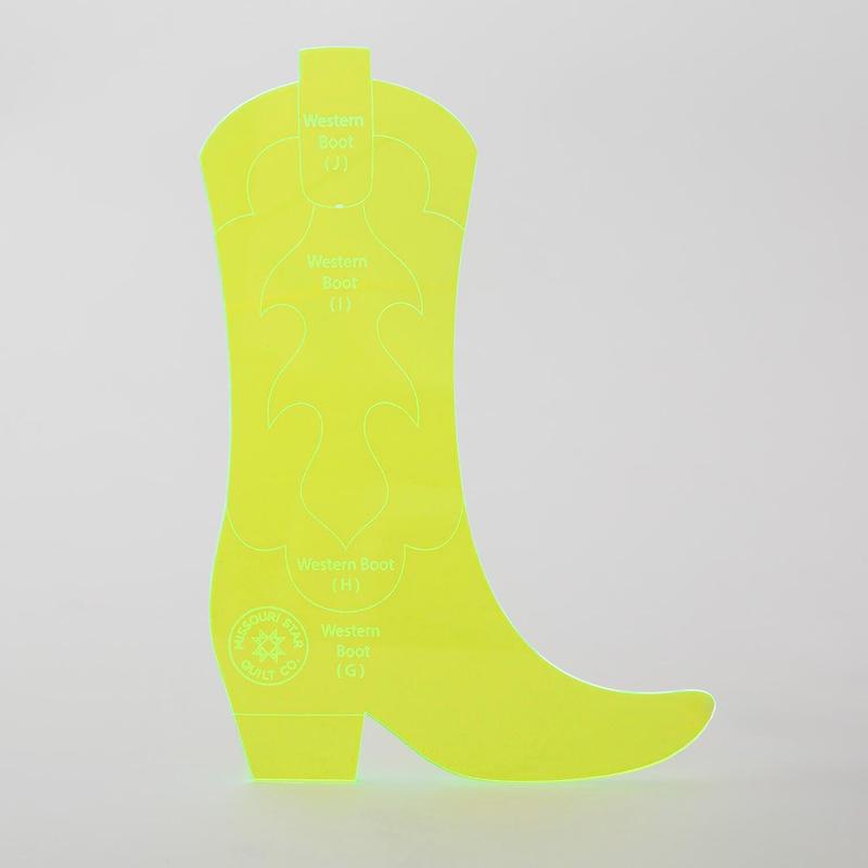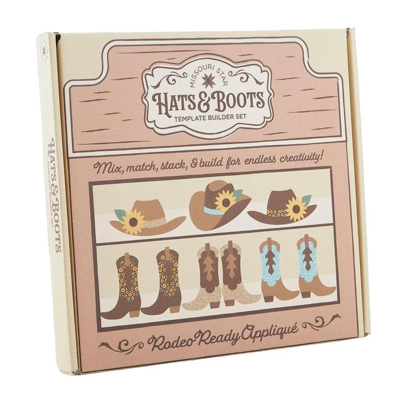 set includes templates for cowboy boots, western hats, and accessories. The appliqué shapes allow you to mix and match to create endless combinations. Includes all these shapes (with lettered shapes being pop-out pieces from the main template):