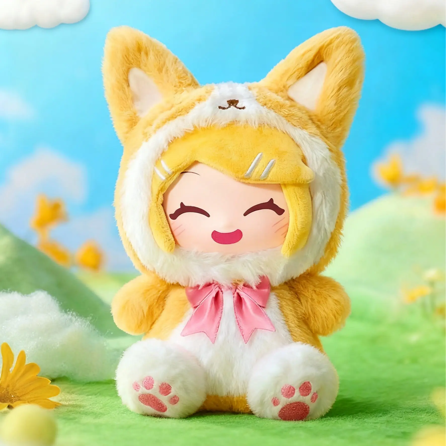 I LOVE HER!!!! SHES SOOO CUTE AND THE MATERIAL IS SO SOFT, THE QUALITY IS SUPER HIGH, AND HER FACE IS HARD LIKE A LITTLE DOLL AND I LOVE IT SOO SO MUCH! MY HAND IS IN THE PHOTO FOR REFERENCE OF SIZE! I LOVE HER! I GOT HER FOR A DISCOUNT AND I HIGHLY RECOMMEND SHES ADORABLE