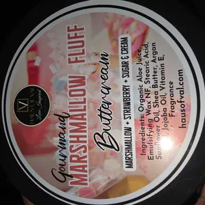 Sweet fluffy marshmallow strong scent and very moisturizing on skin.