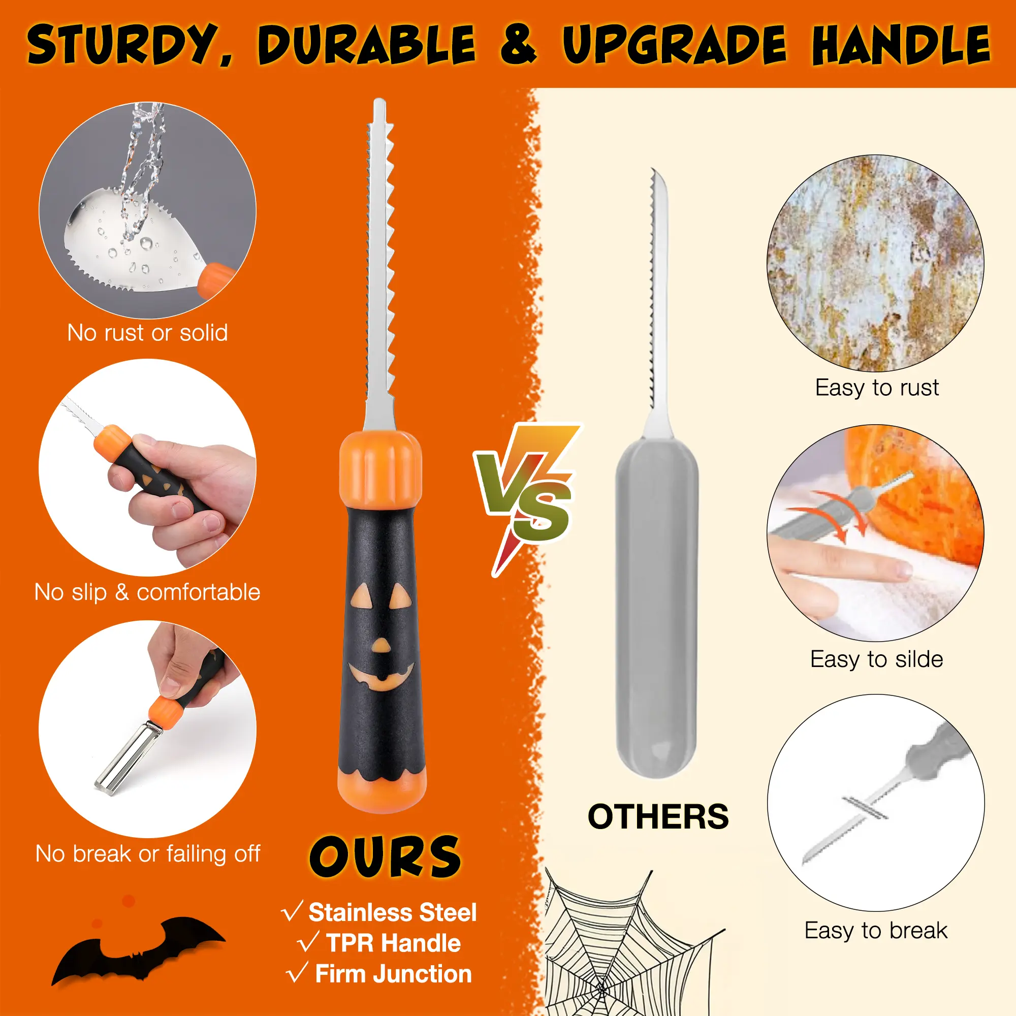 ·🎃𝐃𝐮𝐫𝐚𝐛𝐥𝐞 𝐂𝐨𝐧𝐬𝐭𝐫𝐮𝐜𝐭𝐢𝐨𝐧: Each pumpkin carving tool has a soft rubber handle for comfortable use, while the blades are made from high-quality stainless steel. The blades are securely attached to the handles, ensuring they won’t break or rust, making them durable enough for repeated use