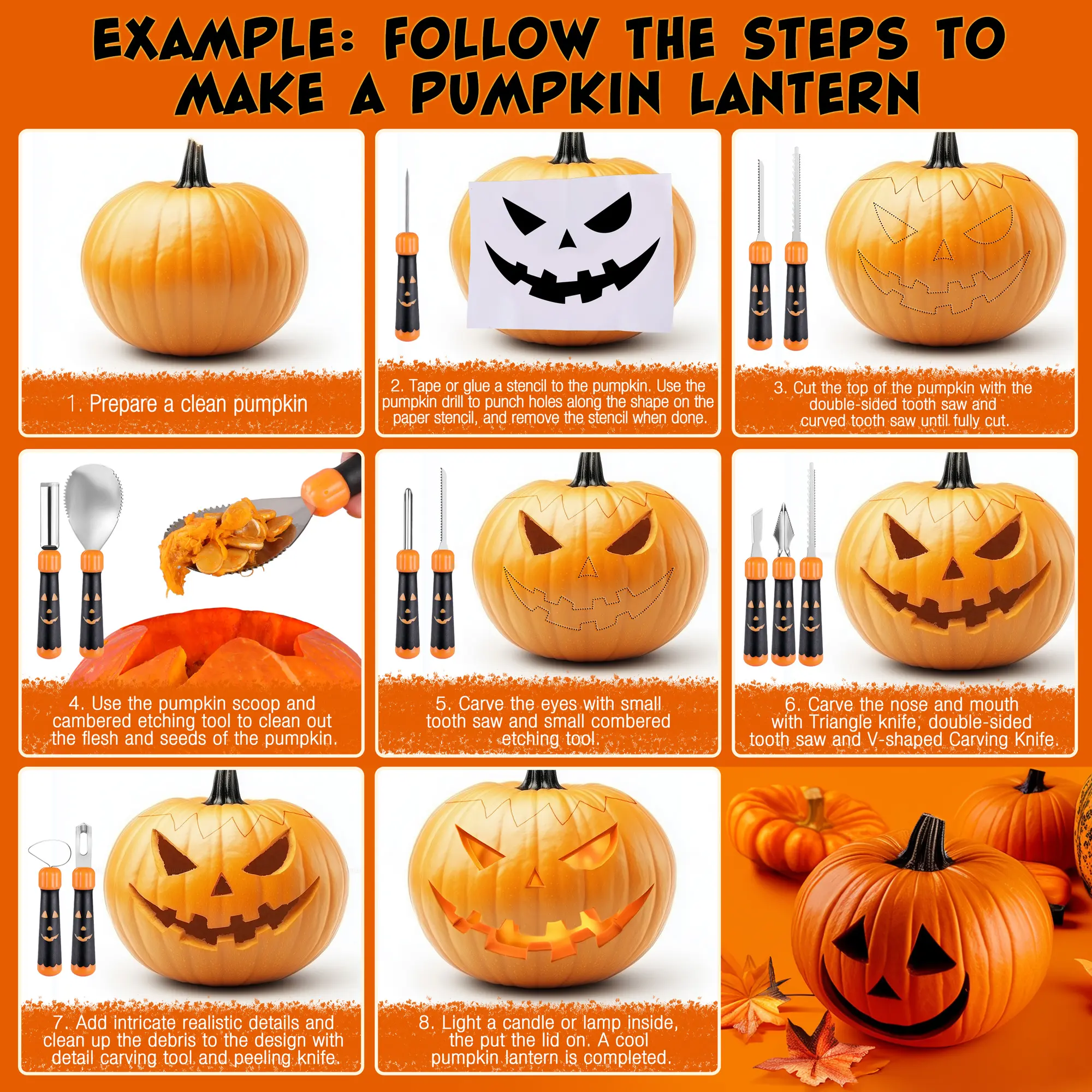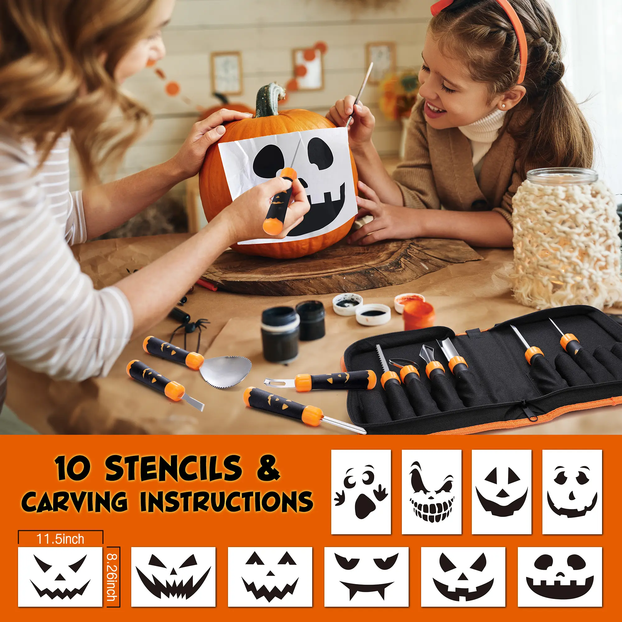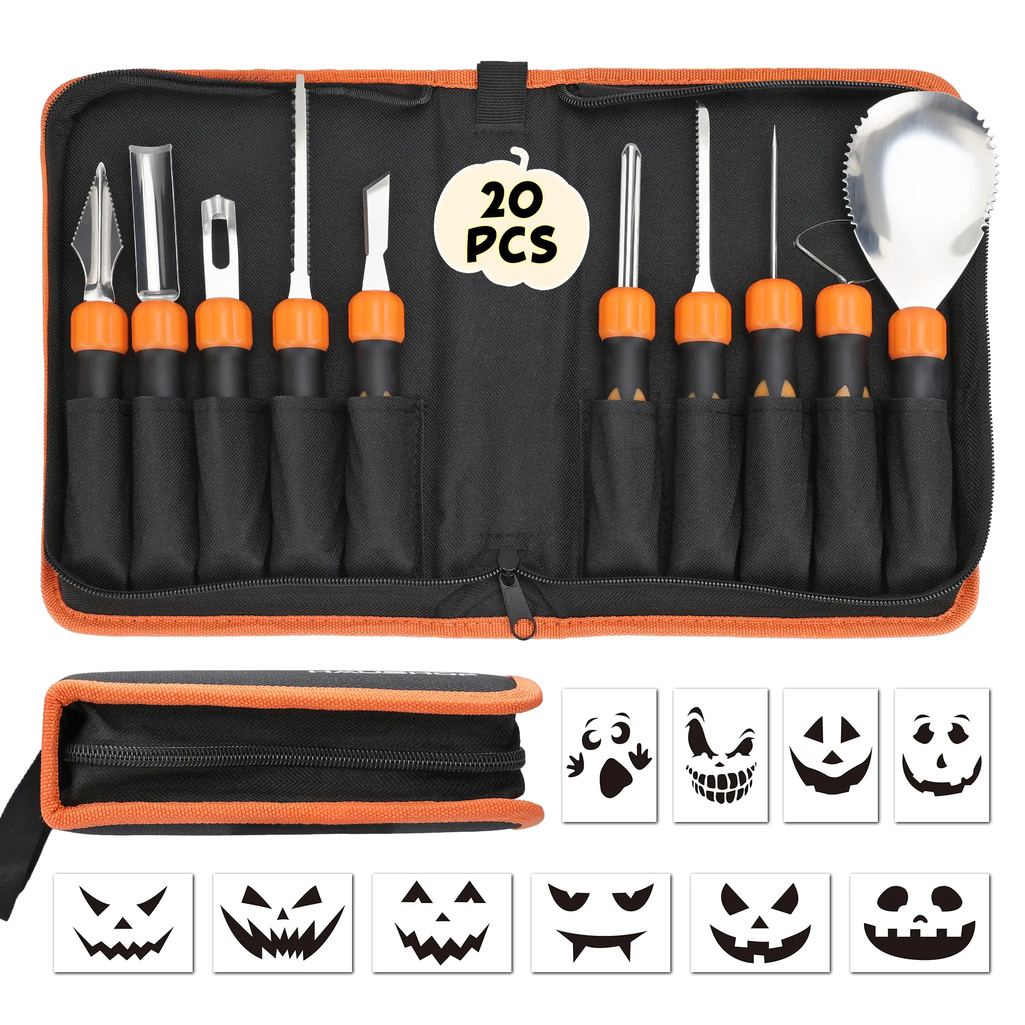·🎃𝐕𝐞𝐫𝐬𝐚𝐭𝐢𝐥𝐞 𝐏𝐮𝐦𝐩𝐤𝐢𝐧 𝐂𝐚𝐫𝐯𝐢𝐧𝐠 𝐊𝐢𝐭: The HAUSHOF Pumpkin Carving Kit includes 10 carving tools and 10 pumpkin stencils, designed to meet various carving needs. The Carving kit includes 2 X cambered etching tools, 1 X double-sided saw, 1 X pumpkin drill, 1 X triangular tool, 1 X small tooth saw, 1 X pumpkin scooper, 1 X V-shaped carving tool, 1 X curing tool, 1 X peeling tool