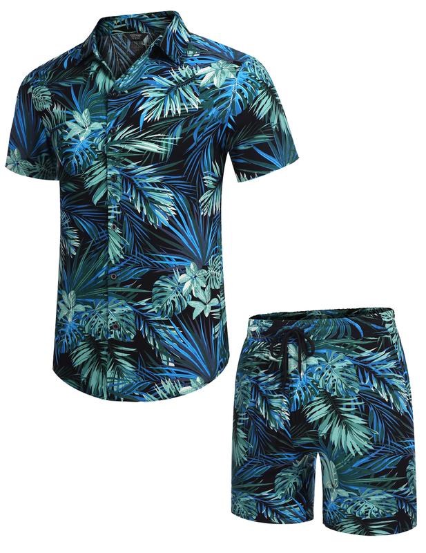 ·SUMMER CASUAL FLORAL SET--- Men's Hawaiian Shirt loose fit, button-down short sleeve, spread collar; Beach Shorts with slanted side pockets and rear pockets, elastic waist drawstring. Simple and classic matching of shirts and shorts suits, save you the time of choosing to match.