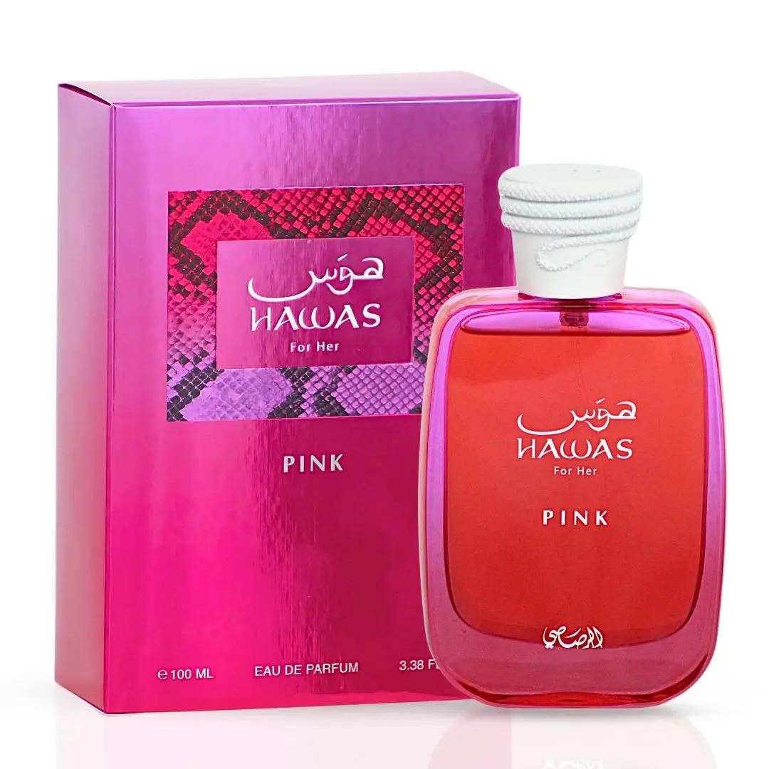 Hawas Pink by Rasasi is a playful yet elegant fragrance that blends sweet gourmand notes with warm florals and soft spice. It opens with a radiant burst of neroli, enriched with the warmth of cinnamon and nutmeg. The heart reveals a delightful blend of orange flower, creamy tuberose, and a golden marshmallow accord that adds a soft, sugary charm.