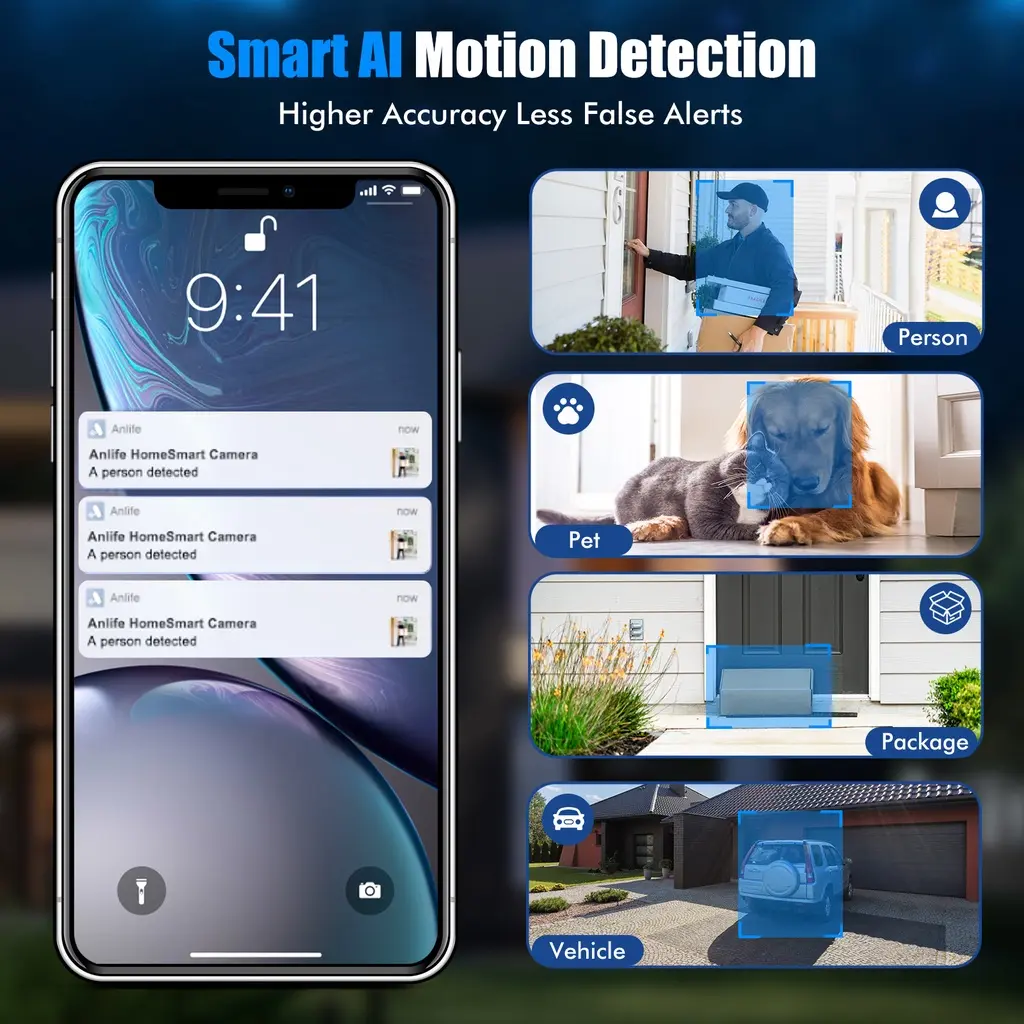 ·AI Motion Detection Recognition: Reduces false alarms by 90% and allows for customizable motion detection areas.