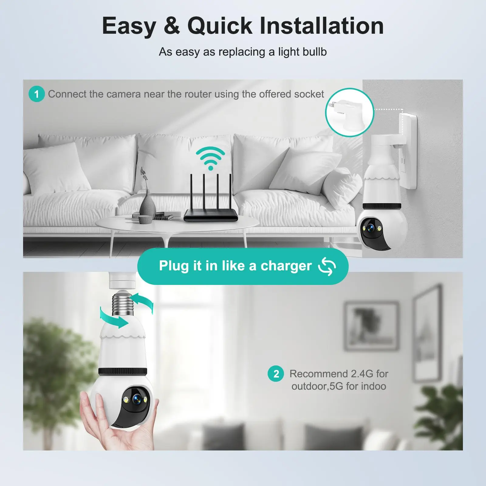 Easy Installation and Quick Setup- Installation: As easy as changing a light bulb, install the Bulb Camera into a regular light bulb socket (110V~240V).- Setup: Set up in 3 minutes with the QR code. No drilling, no wiring, no power cord required.
