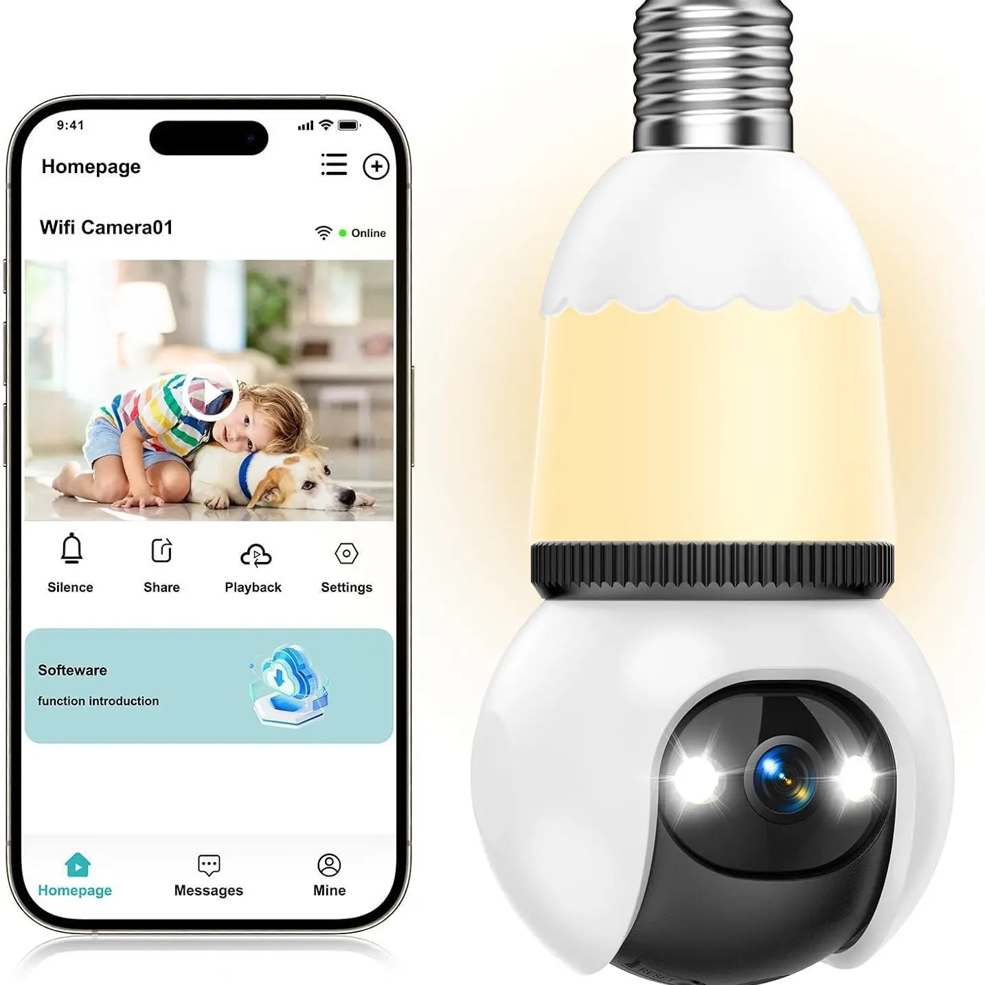 Image Description- Light Bulb Camera: The image shows the Hawkray Infrared Night Vision 5G and 2.4GHz Wireless Indoor/Outdoor Security Camera in a light bulb design.- Mobile App: The image also shows the mobile app interface for the camera, including options for silence, share, playback, and settings.