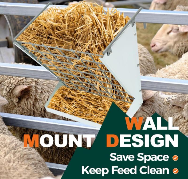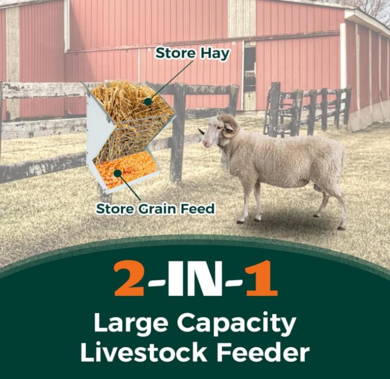 ·Wide Applications: The 2-IN-1 hay and grain feeder with large capacity can store hay in the upper part and grain feed in the lower part, meeting both needs of Goats, Sheep, Horse, Other Farm Animals and Livestock.