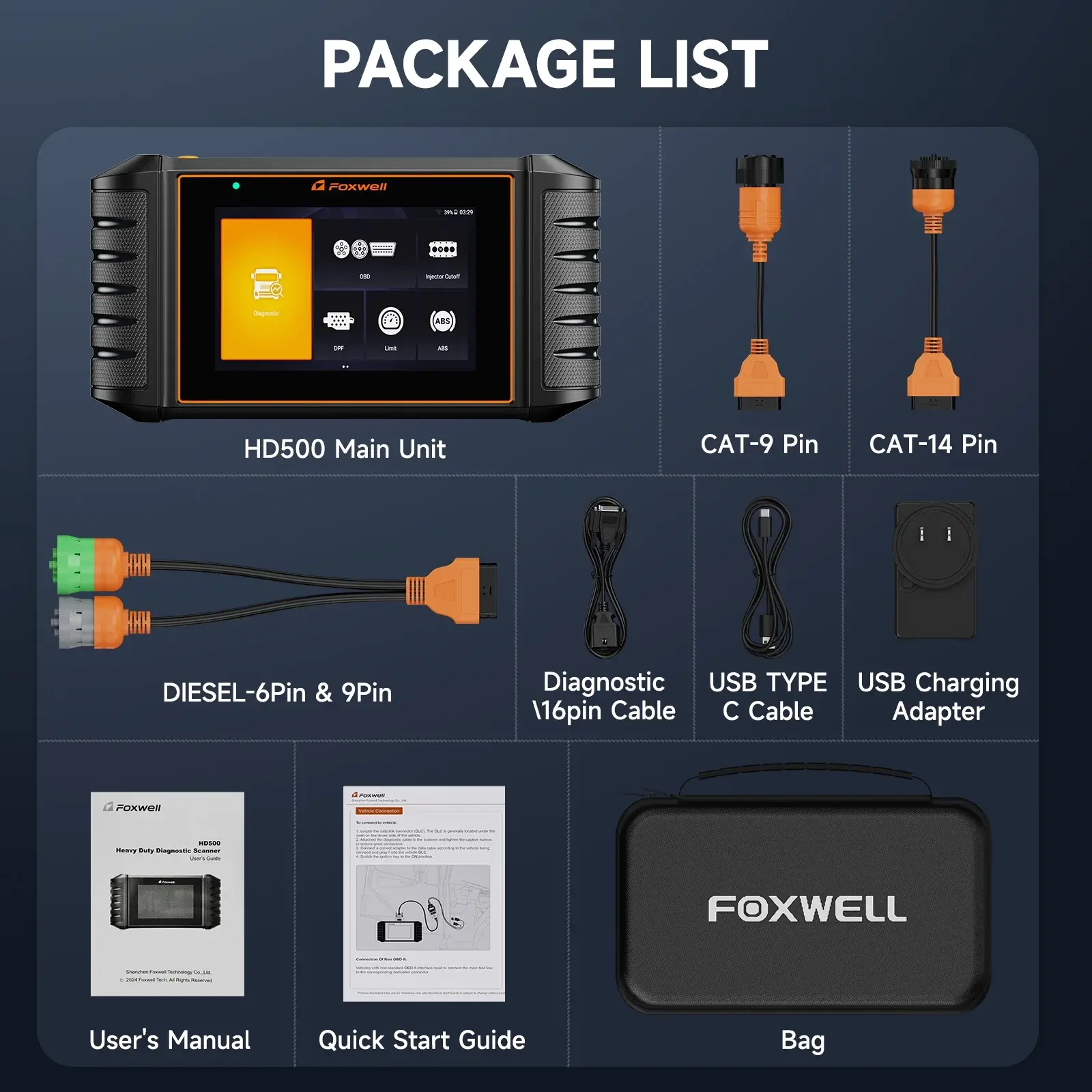 HD500 heavy duty truck scanner is tailored to vehicles equipped with cummins, cat, detroit, paccar, international, hino and more engines. This diesel scan tool come with diverse adapters, including diesel 6 & 9 pin, CAT-9 pin, CAT-14 pin, 16 pin cable. It is engineered to deliver accurate and reliable diagnostics, ensuring compatibility and effective troubleshooting for your trucks.