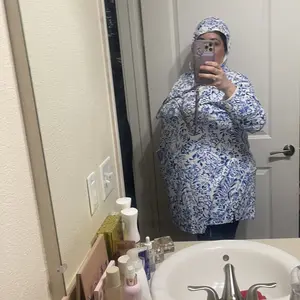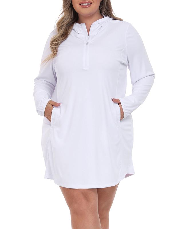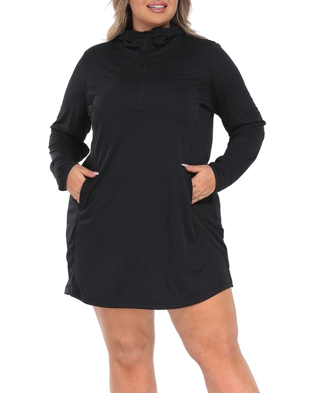 Our hooded beach coverup dress is perfect for women fitting sizes 1X-3X. Choose based on your bust size: (1X) 44-46", (2X) 48-50", (3X) 52-54". The model, 5'7" tall, wears size 1X. It features a trendy half-zip neckline and two front pockets for added convenience. Stay stylish and functional with this versatile beach dress.