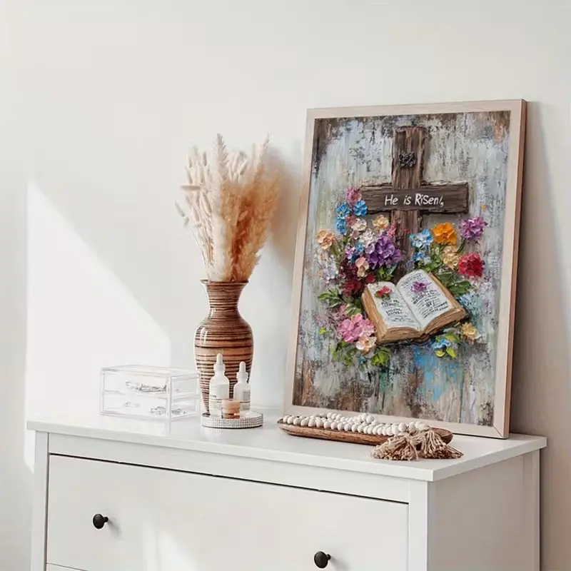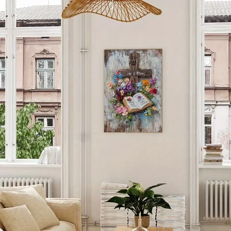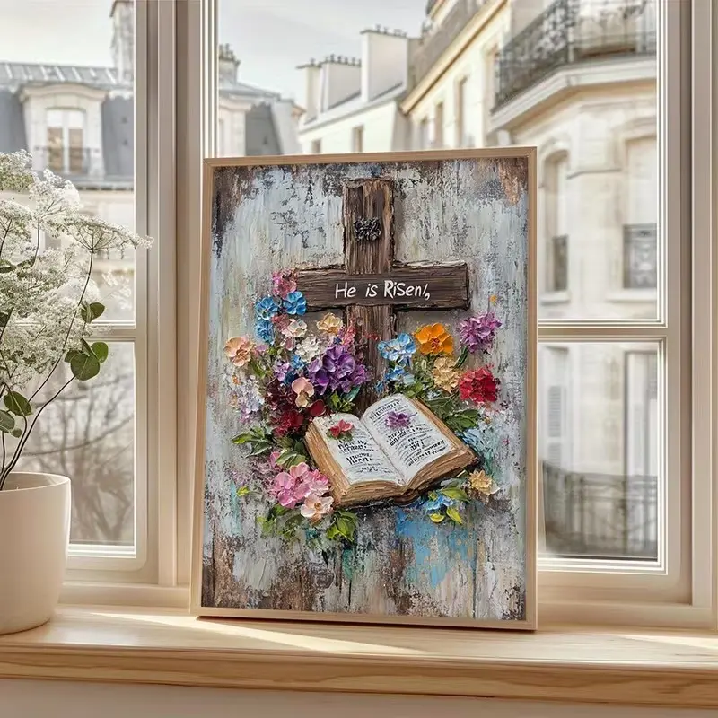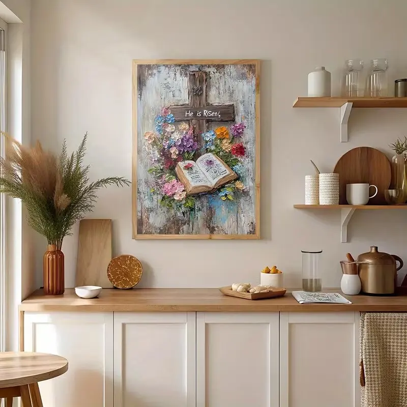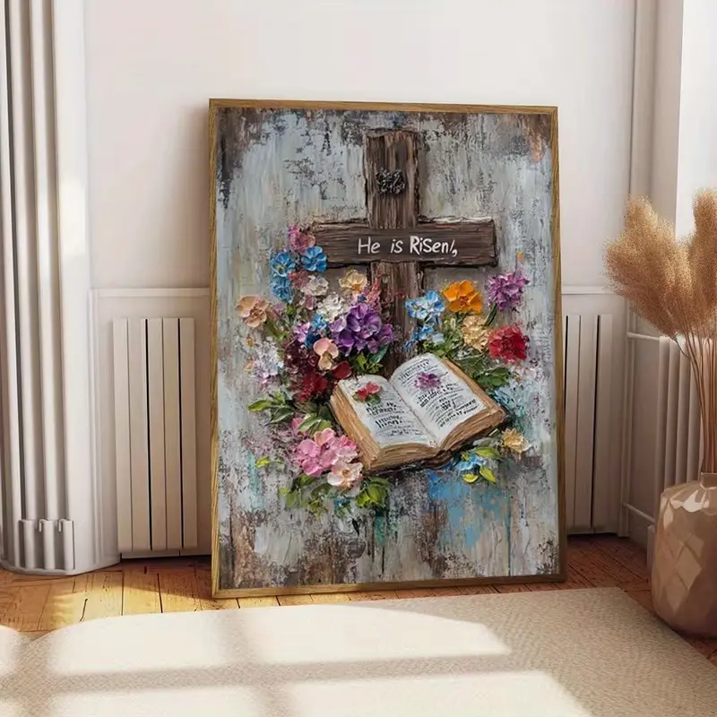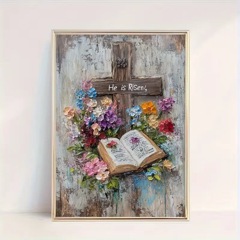·Christian Easter Decor: This poster features a rustic cross, open Bible, and floral texture. Perfect for Easter decor. 📖🌸