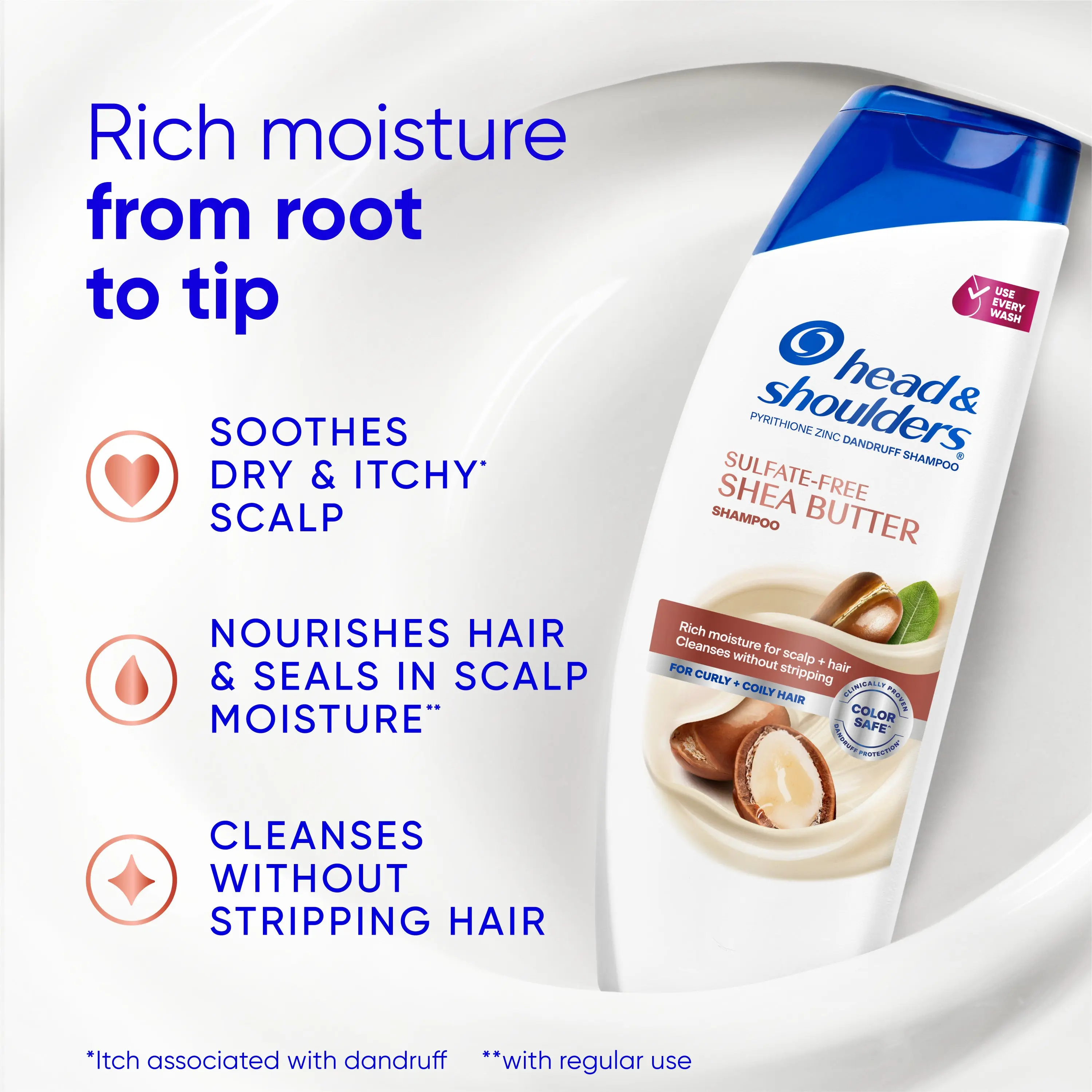 Head and Shoulders Shea Butter Sulfate-Free Shampoo will ignite your senses with its rich creamy texture. You’ll feel it working with every wash as our hydrating formula quenches your curls and coils while our active ingredient, pyrithione zinc. Use regularly to help stop dandruff at its source and enjoy healthier, softer hair. Lock in your hair and scalp benefits by pairing with Head and Shoulders Shea Butter Conditioner.