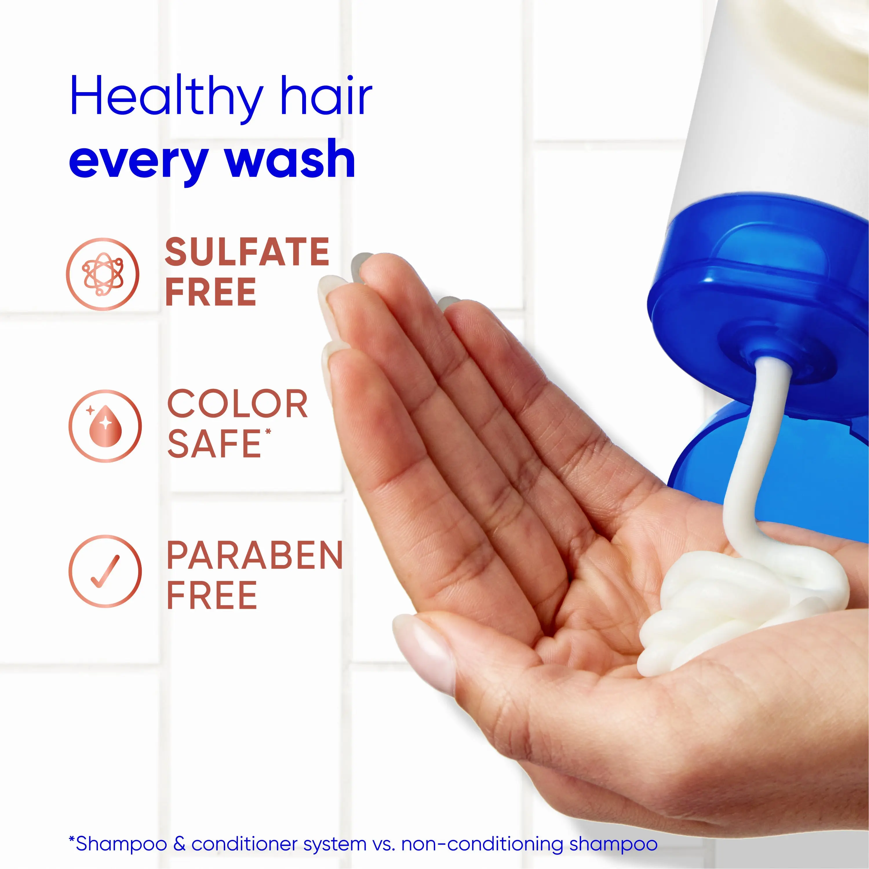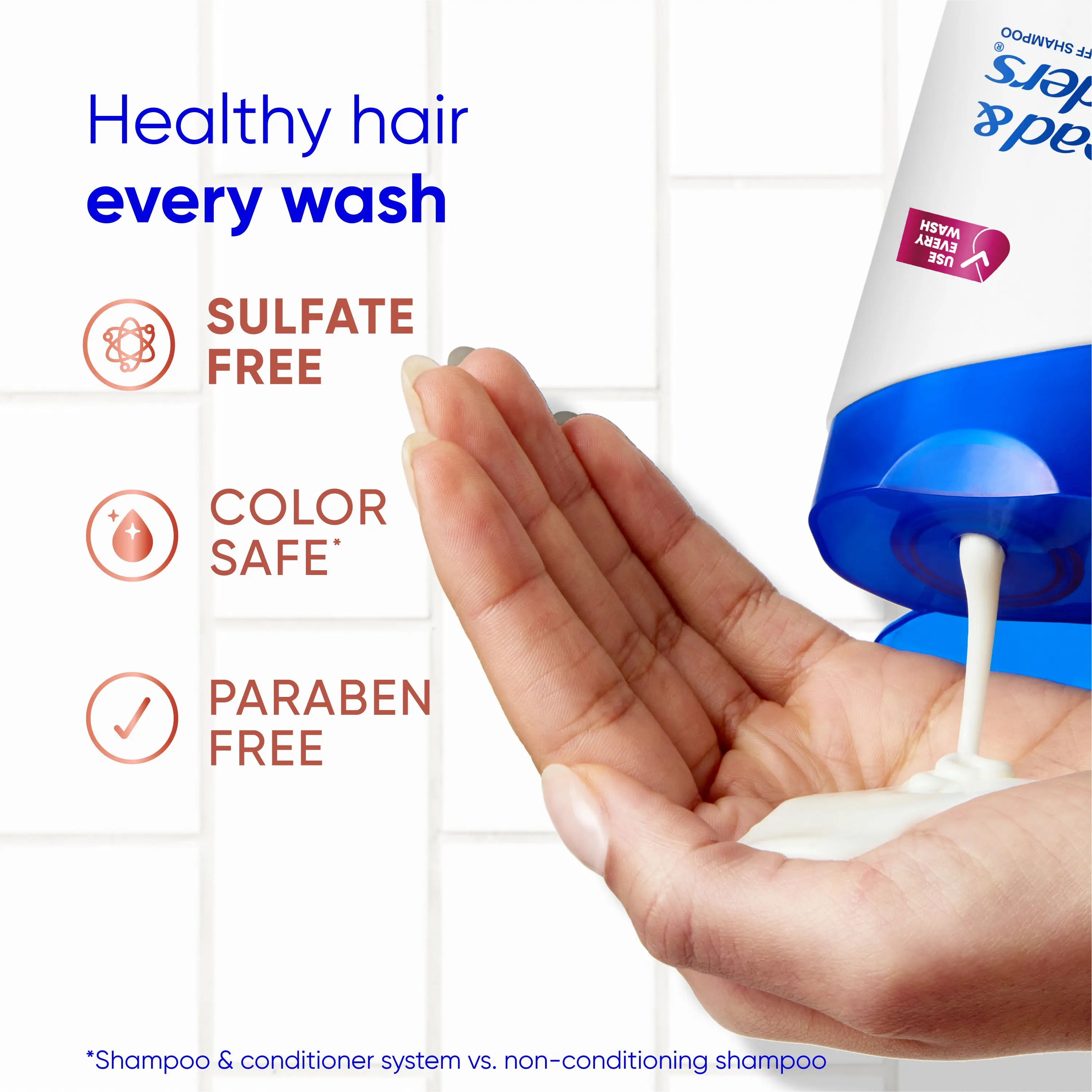 *visible flakes; with regular use; ** based on volume of sales + associated with dandruff ^ washes away oil and flakes † vs. non-conditioning shampoo