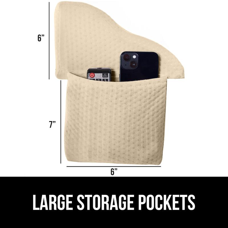 CONVENIENT, LARGE STORAGE POCKETS: Large storage pockets on each side of the pillow measure 6 inches by 7 inches to conveniently keep small items such as phones, remote controls, eyeglasses and more within reach