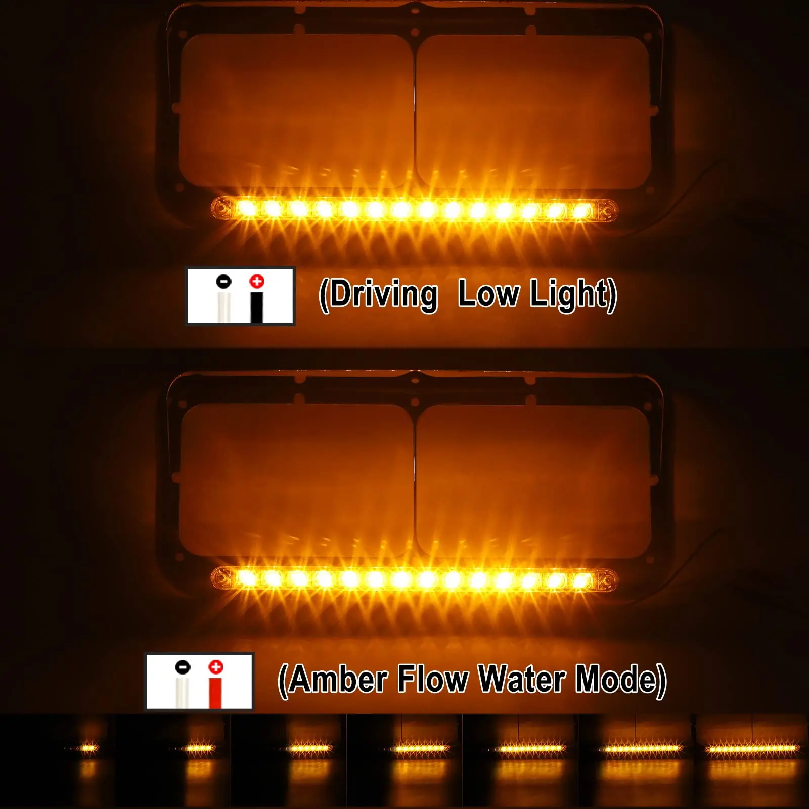 ·There is an amber led sequential light bar on the bottom of each headlight bezel, dual intensity. The function of the bottom LED bezel depends on how this amber light bar is wired, so this amber strip light can function both as a running light or marker light when low intensity, and as a turn signal light when in high intensity: White wire is ground, black wire is low brightness and red wire is high brightness (Sequential Turn Signal).