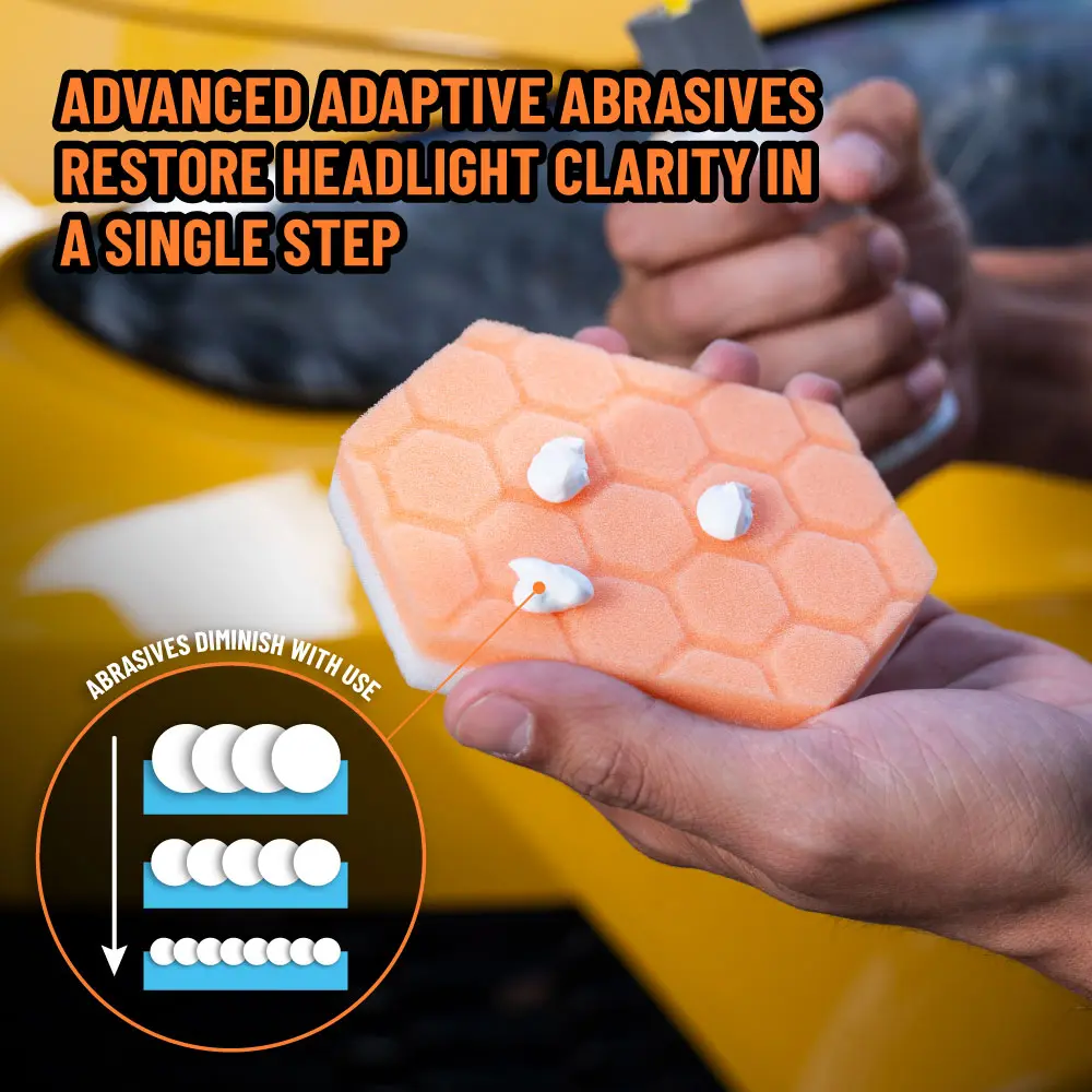 Featuring innovative adaptive abrasive technology, Headlight Restorer IQ utilizes polishing particles that actively diminish in size as you work, starting with a powerful cutting action that tackles haze and oxidation on your headlights, taillights, and other plastic lenses. As these abrasives break down, they transition to a fine polish, smoothing the lens surface for optimal clarity. This all-in-one product provides professional-grade results without the need for multiple products or steps.