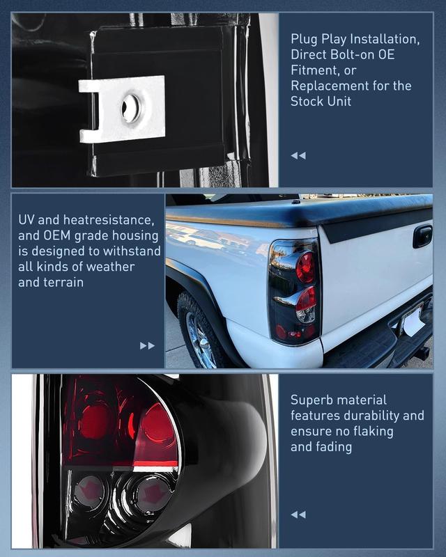 ·Compatibility: The headlight and taillight assemblies are compatible with 1999-2002 Chevy Silverado 1500;2001-2002 Chevy Silverado 1500HD;1999-2002 Chevy Silverado 2500;2001-2002 Chevy Silverado 2500HD;2001-2002 Chevy Silverado 3500. Not suitable for Barn Door, Stepside models. Not suitable for chevy tahoe. Please confirm the vehicle fitment before ordering