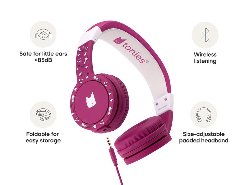 Purple tonies® headphones for kids offer a kid-safe limit of 85 dB, adjustable cushioned earpads, and a padded headband for kids that can grow with them. Fold the headphones for easy storage for on the go!