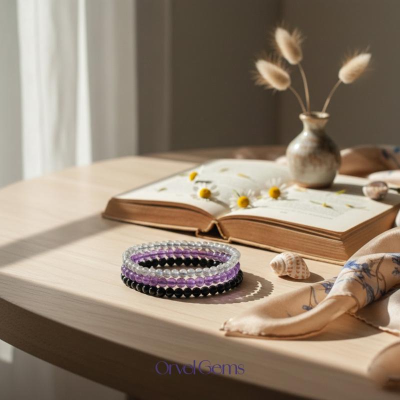 This set features 4mm beads of Amethyst, Labradorite, and Black Onyx, perfect for stacking. Each bracelet brings powerful energy for protection, transformation, and emotional balance