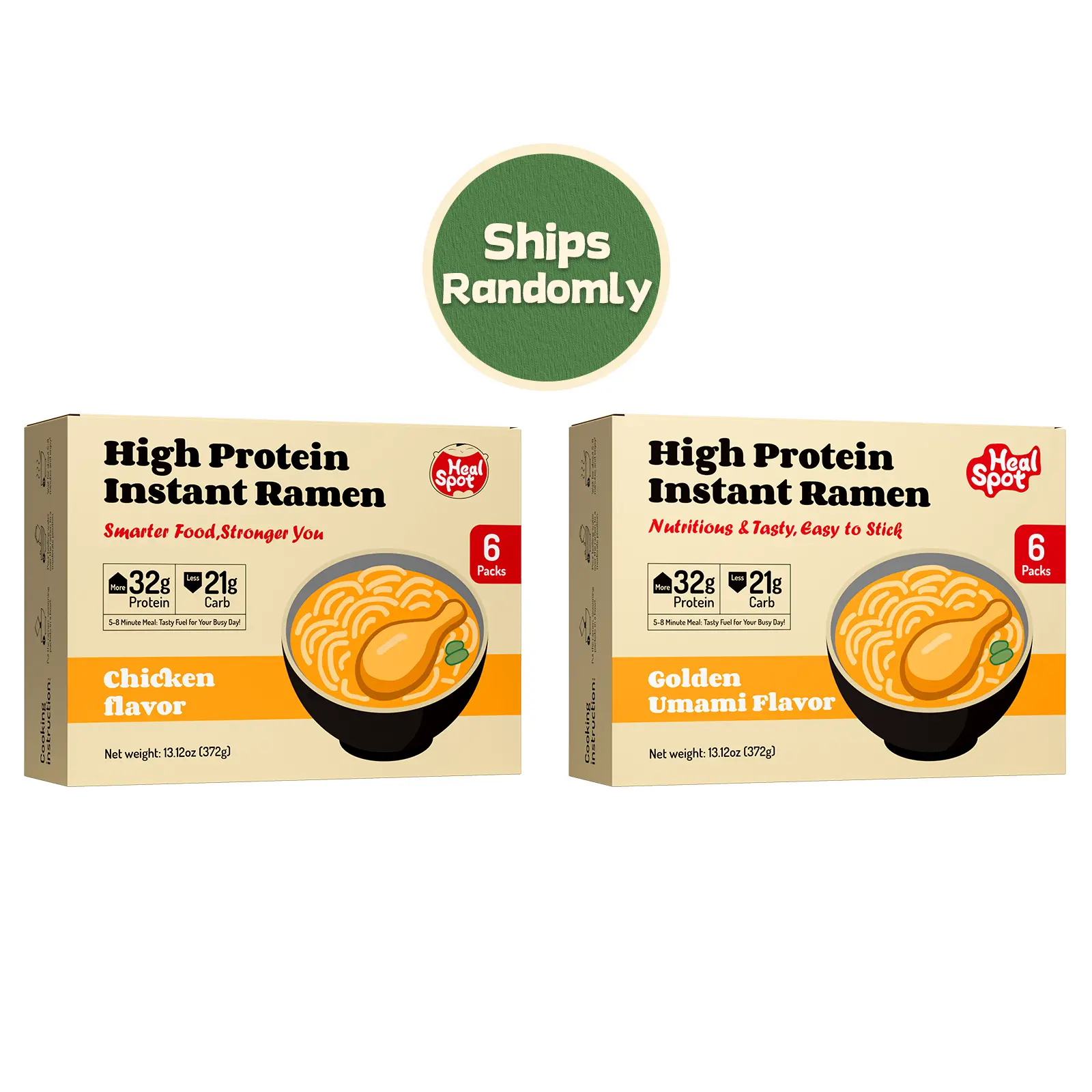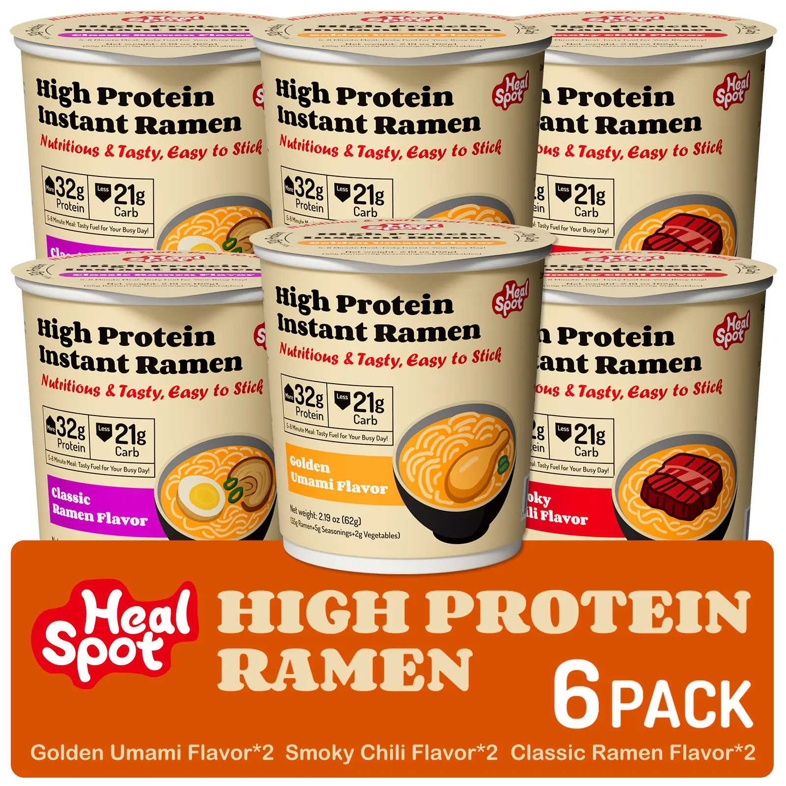 Healspot High-Protein Instant Ramen Cups, 6-Pack – Non-Fried Noodles with 32g Plant-Based Protein, Low Fat, Low Carb, Non-GMO, Keto Friendly (Golden Umami, Smoky Chili & Classic Ramen Flavors)