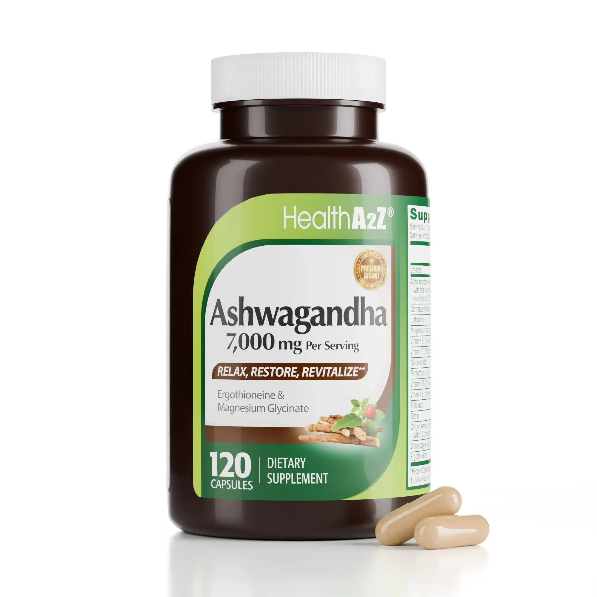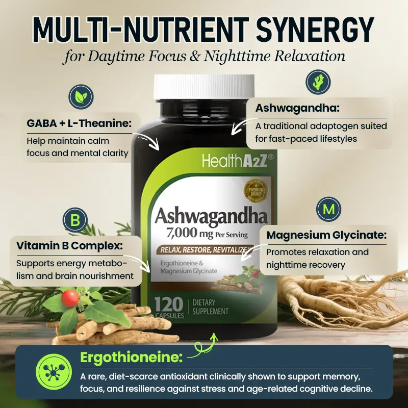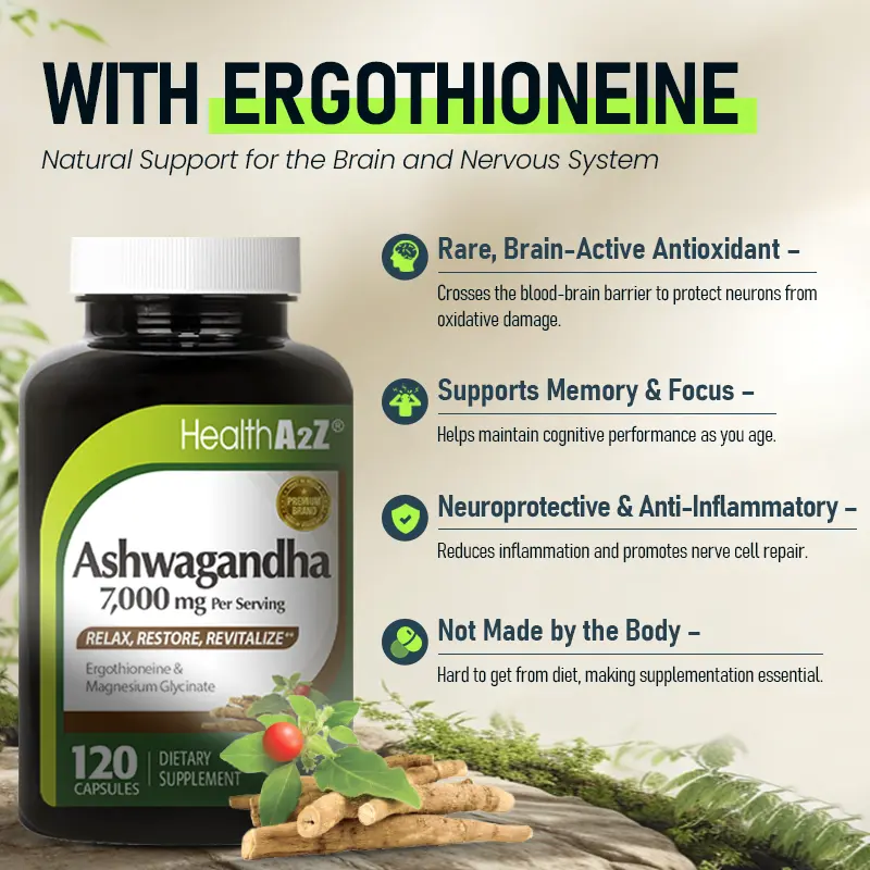 HealthA2Z Ashwagandha 7,000mg - 120 Capsules (Pack of 1) - Ashwagandha, Ergothioneine, GABA, L-theanine, Magnesium Glycinate - Supports Stress Relief, Mood & Sleep, Mental Clarity, Metabolism, Energy