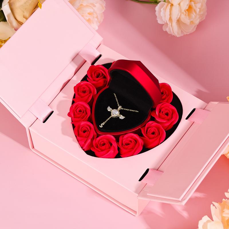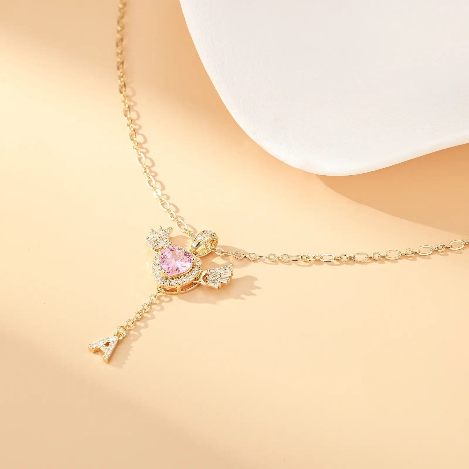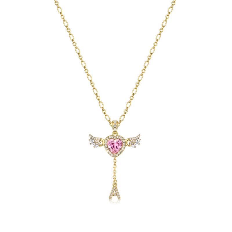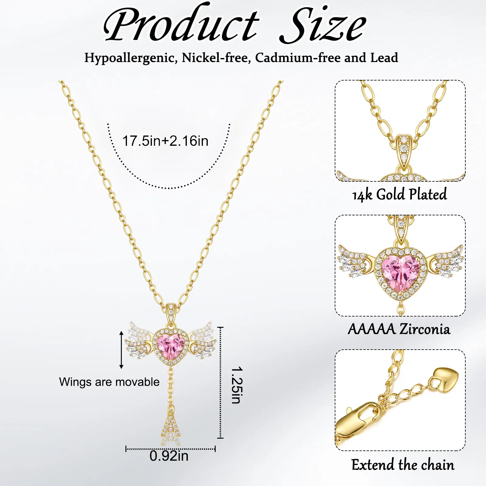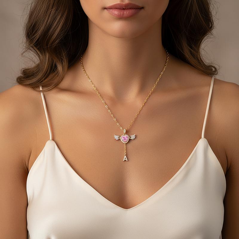 This romantic Heart Angel Wing Pendant Necklace features a sparkling heart-shaped cubic zirconia, surrounded by dazzling stones and angel wing details. It symbolizes love, protection, and elegance. Crafted with a 14K gold plated O-link chain and an adjustable heart tail chain, it offers durability and a customized fit. The unique drop-shaped zircon accent adds extra charm and sophistication.