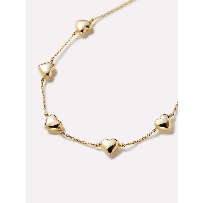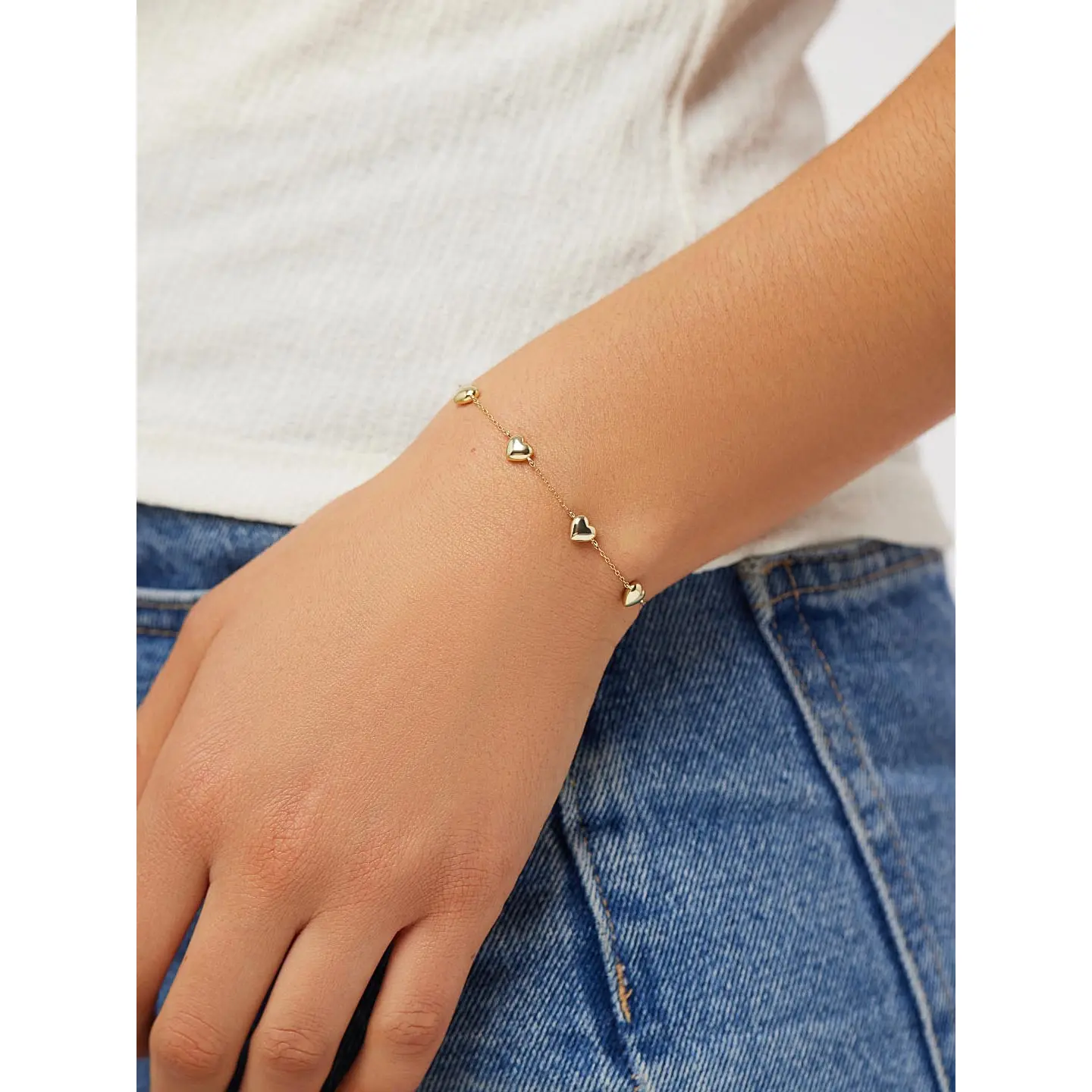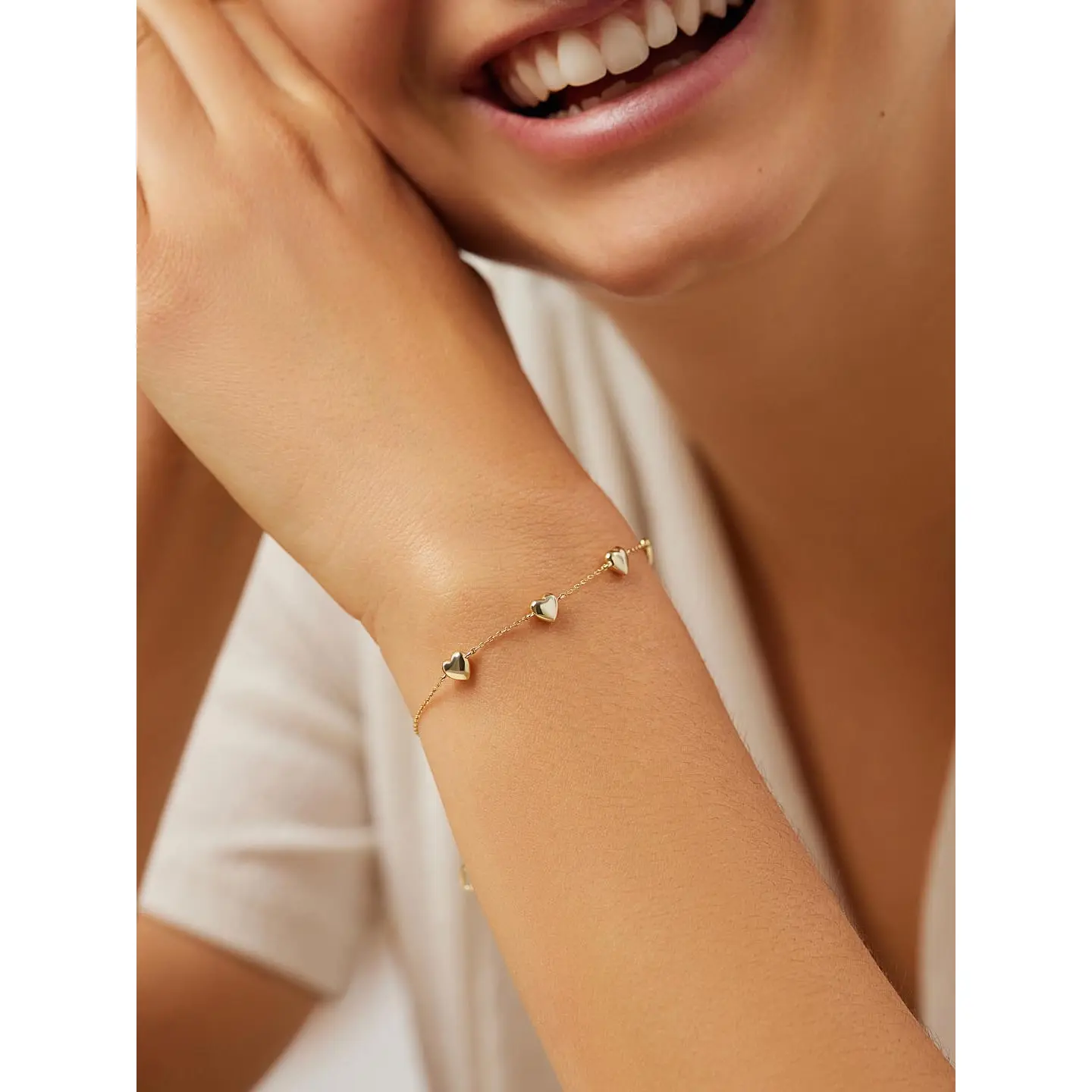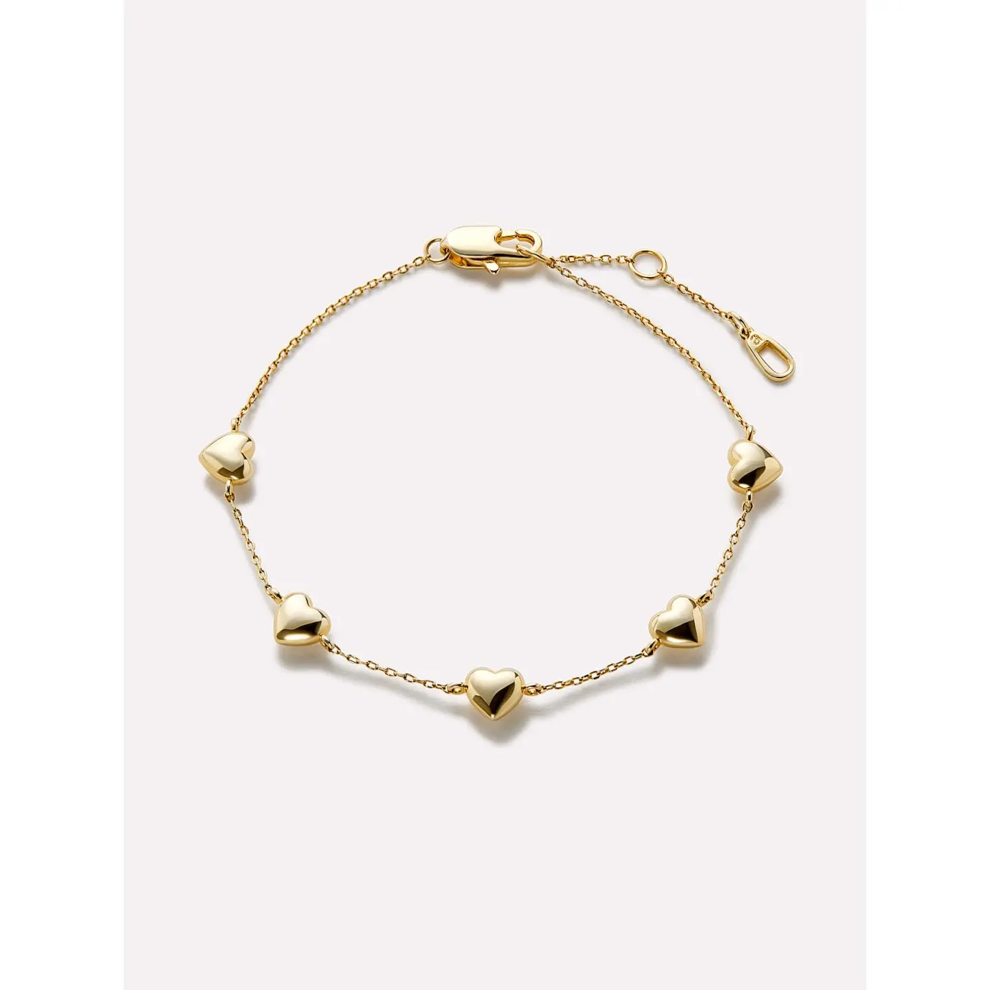 The perfect puffy piece, this dainty heart bracelet features a chic and shiny polished finish. Dipped in 14k gold with 5 heart-shaped pendants, this bracelet can be worn on its own or added to an already existing stack. Pair this heart bracelet with our Luxe Links Bundle for effortlessly easy stacking.